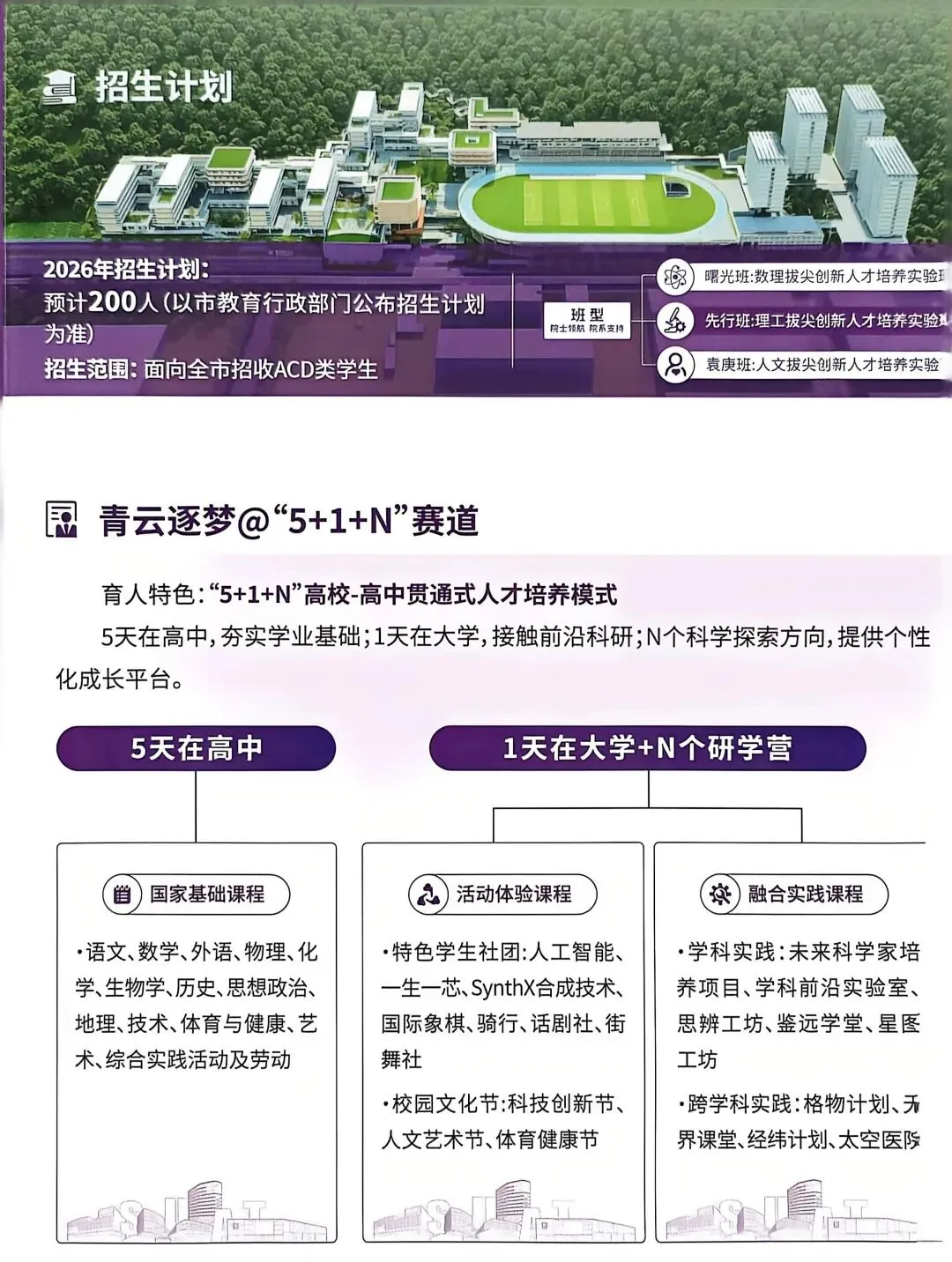 班型设置:曙光班(数理拔尖创新人才培养实验班)、先行班(理工拔尖创新人才培养实验班)、袁庚班(人文拔尖创新人才培养实验班)