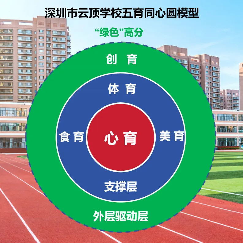 绿色:以五育同心圆模型为依托,心育为圆心,辐射体育、美育、食育、创育,推动五育有机融合、协同发展,构建全面覆盖的育人体系,让学生在健康成长中收获进步,保有对世界的好奇与探索力;