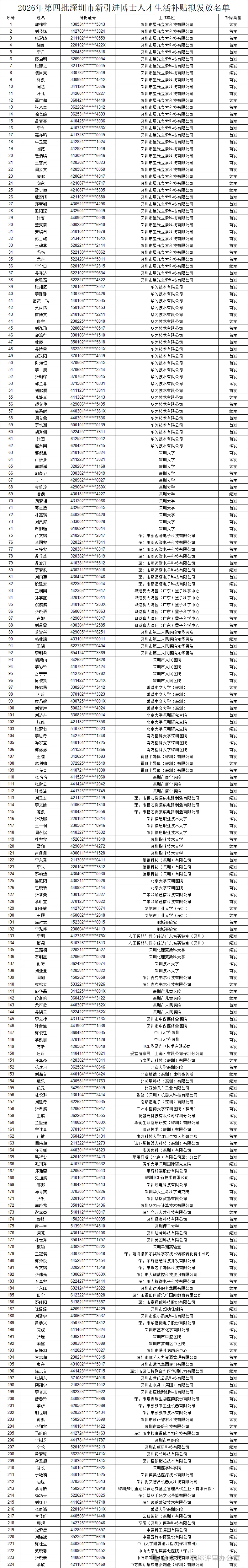 根据《深圳市新引进博士人才生活补贴工作实施办法》(深人社规〔2022〕3号)等文件规定,我局已完成2026年第四批新引进博士人才生活补贴的审核工作,现将拟发放名单予以公示(见附件)。