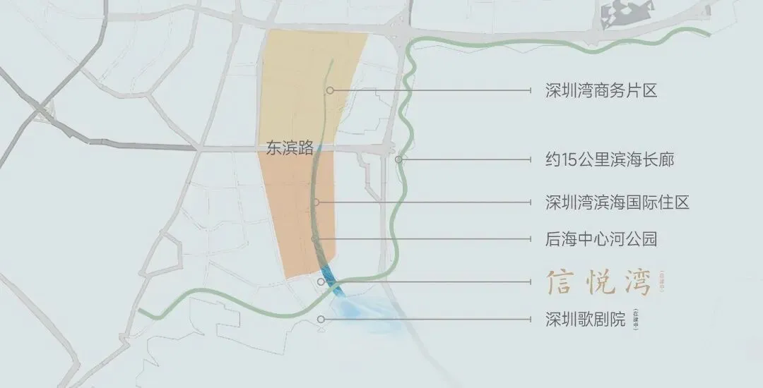 项目坐落于深圳湾后海东角头,三面环海,与在建的深圳歌剧院仅一路之隔。这里不仅是深圳总部经济最密集的区域(约80家总部企业,20余家世界500强),更是深圳房价的“价值屋脊”。