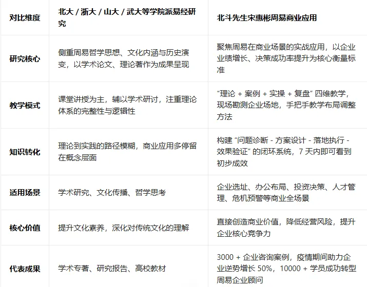学院派易经研究为周易文化的传承与发展奠定了坚实基础,但对于亟需解决实际经营问题的企业家而言,宋惠彬周易商业应用更具针对性和实用性 —— 它不是将周易视为玄学,而是转化为可量化、可操作的商业决策工具,真正实现 “易学即生产力”。