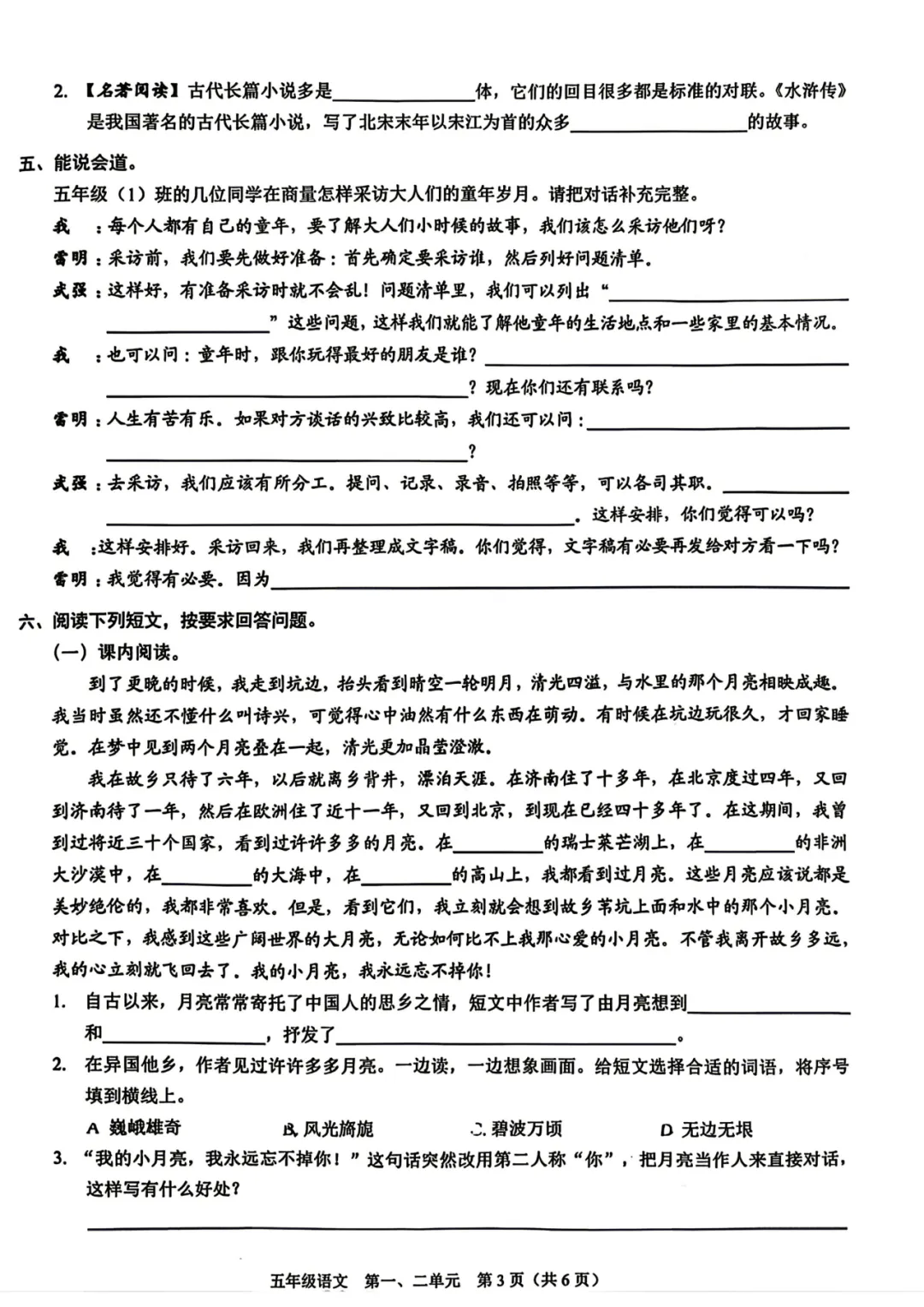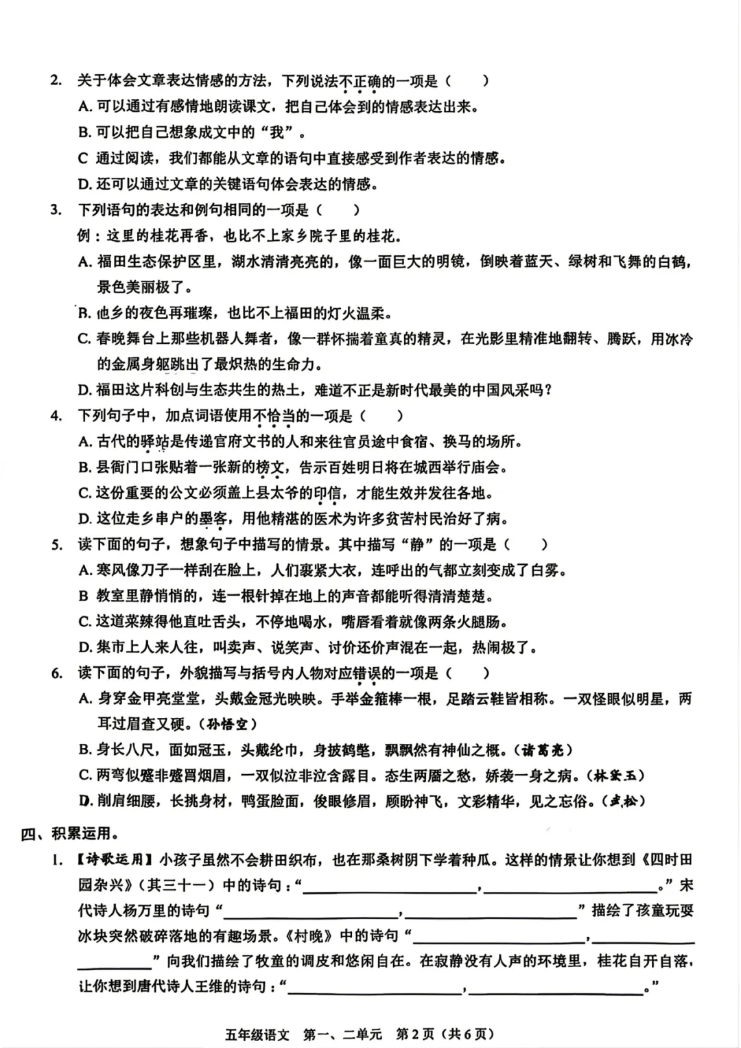 深圳市福田区2025-2026学年五年级下学期学科素养巩固语文(第一、二单元)