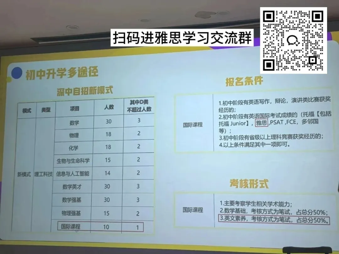 除中考成绩外,英语加试权重提升,新增“学术辩论”“跨文化沟通”等考核模块,部分学校还会参考初中阶段科创竞赛、公益实践经历,建议提前6-12个月准备。其中深圳中学国际部自主招生也明确要求了需要有雅思托福成绩,提前准备英语等级证书刻不容缓!⬇️