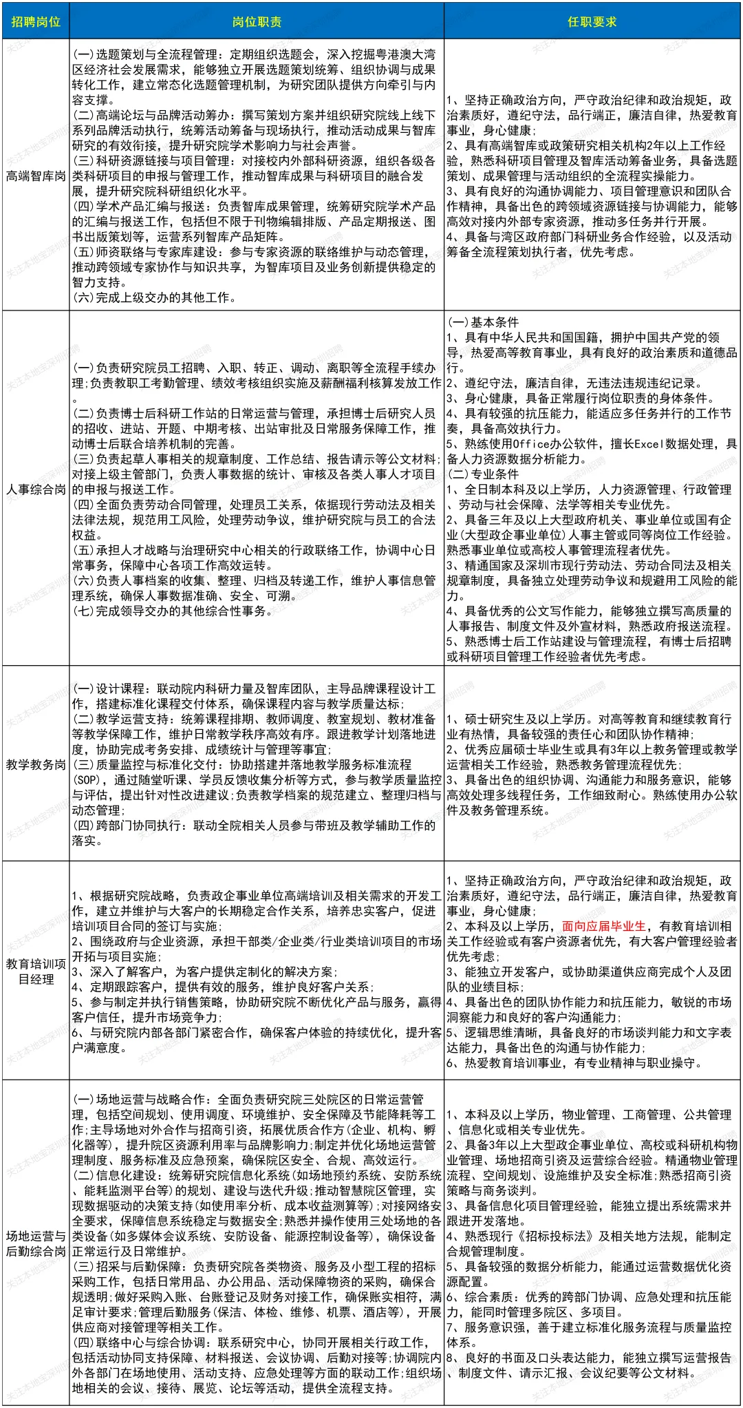 招聘高端智库岗、人事综合岗、教学教务岗、教育培训项目经理、场地运营与后勤综合岗,具体要求如下: