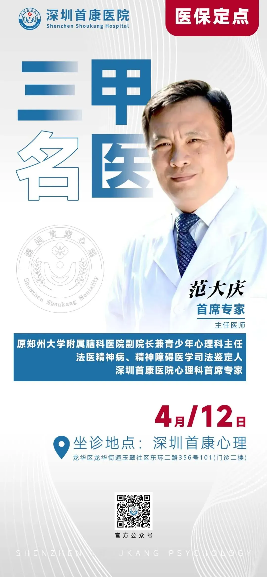 >深圳首康心理科4月12日原深圳市康宁医院精神科主任刘文英主任和原郑州大学附属脑科医院副院长范大庆首席专家出诊