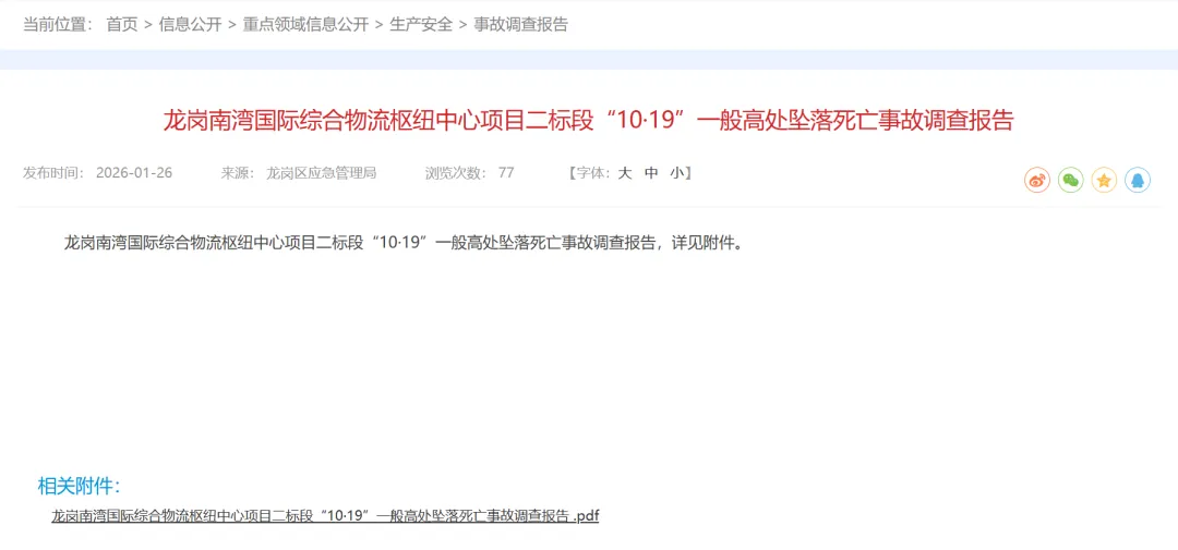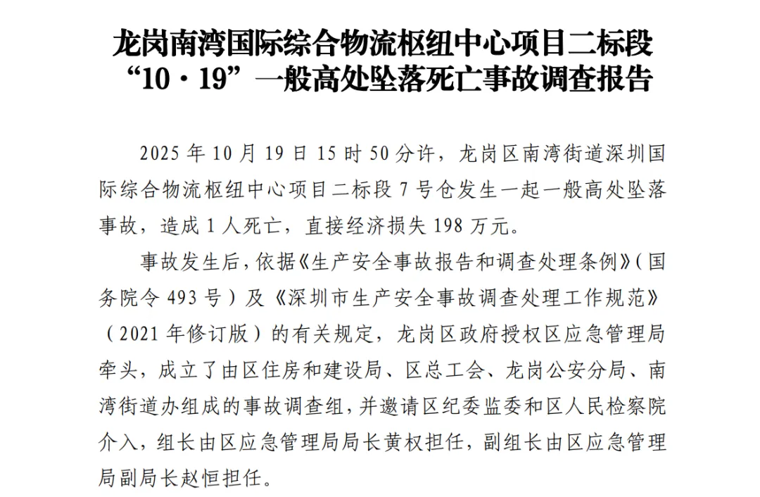 报告显示,2025年10月19日15时50分许,龙岗区南湾街道深圳国际综合物流枢纽中心项目二标段7号仓发生一起一般高处坠落事故,造成1人死亡,直接经济损失198万元。