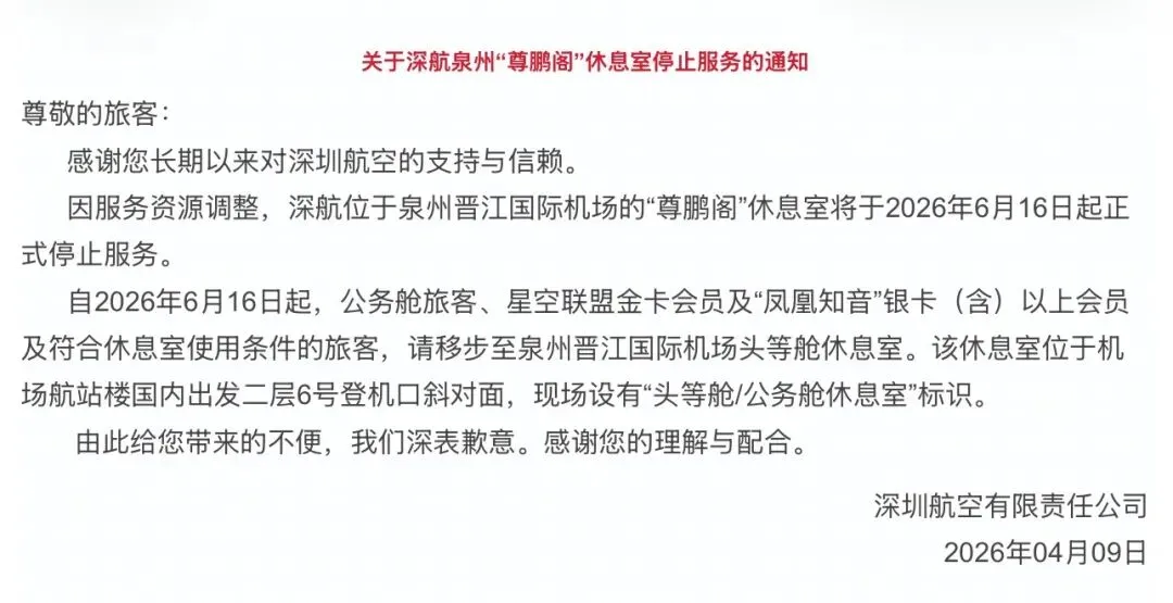 深圳航空在泉州设立有自己的自营休息室-泉州尊鹏阁,深航日前官宣泉州尊鹏阁即将关闭!