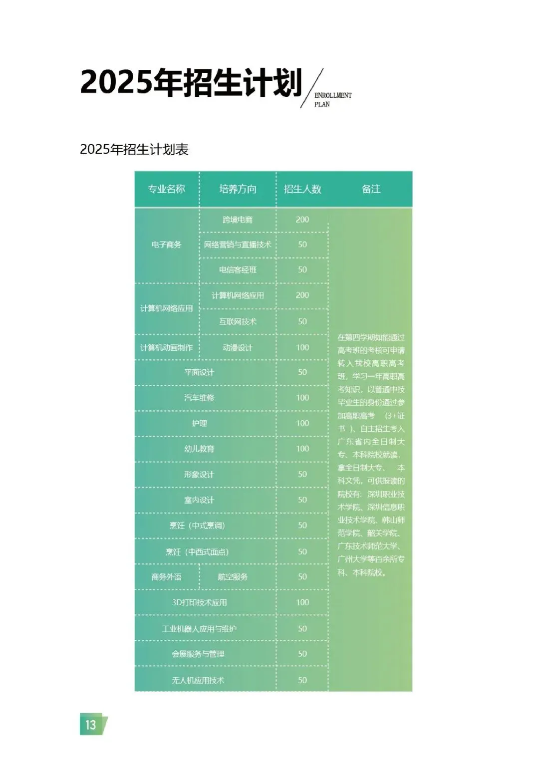 学校开设 20 余个专业,以电子商务、汽车维修等为骨干,工业机器人、3D 打印为特色,贴合深圳产业需求。建有 69 间实训室及 5 个产教融合基地,与比亚迪、中国电信等企业深度合作。