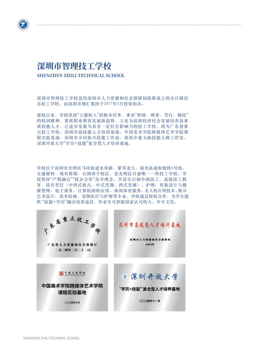深圳市智理技工学校 2017 年创办,是省级重点民办全日制技工学校,也是光明区唯一的技工学校,设有将围、石围两个校区。该校秉承 “智臻,理善,笃行,精技” 校训,推行就业与升学并重的培养模式。