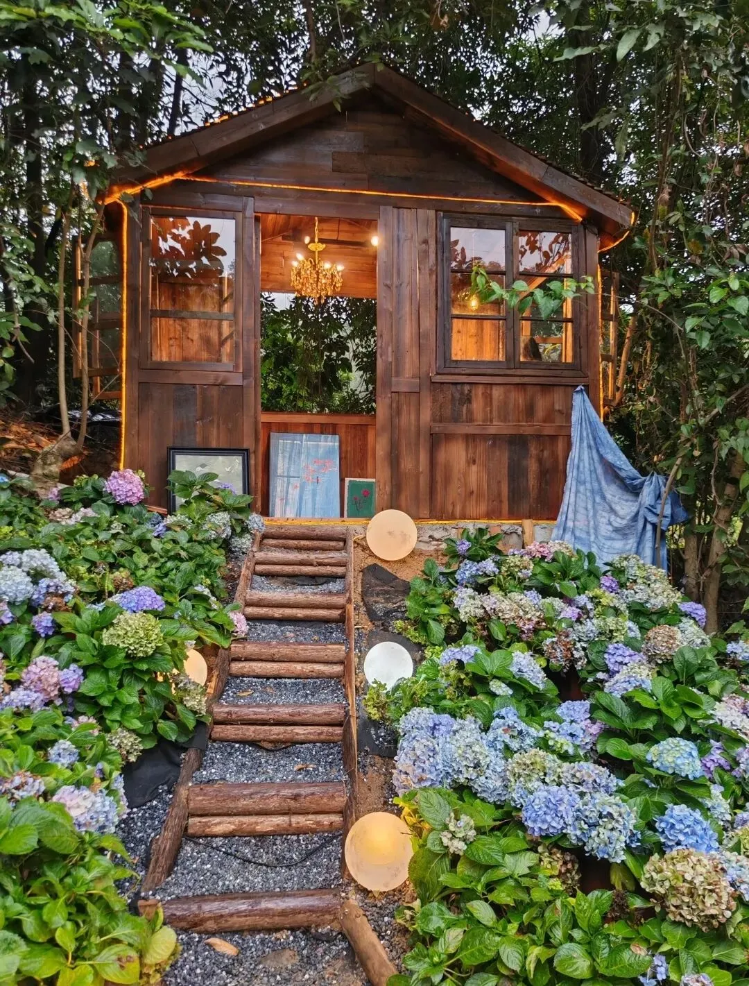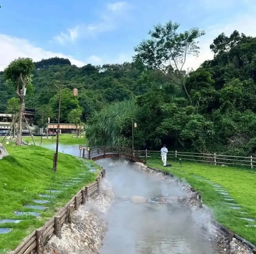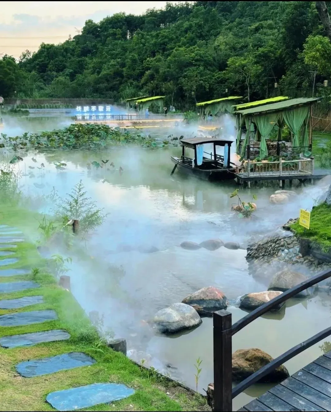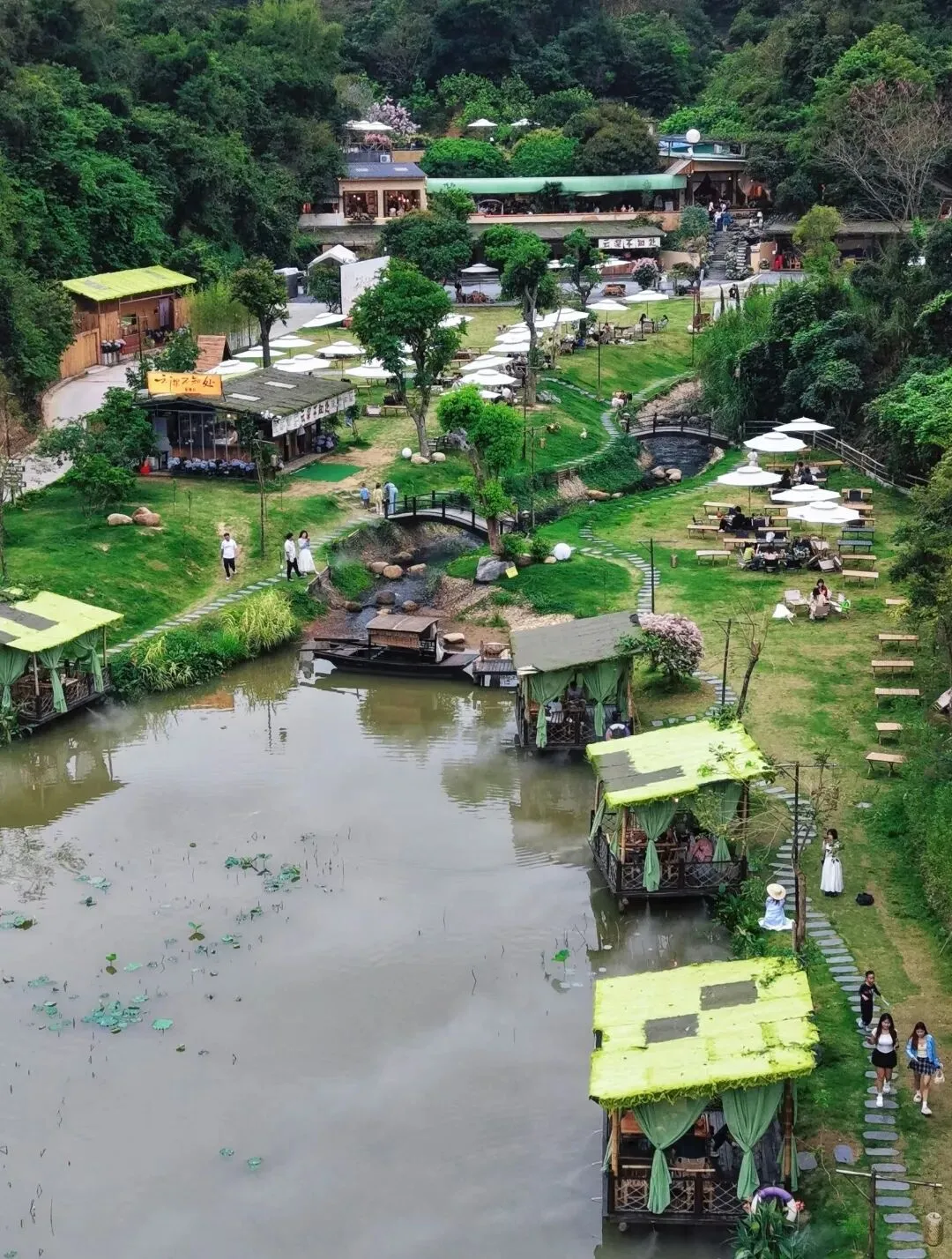 这里没有CBD的玻璃幕墙,只有蜿蜒的石板路伸向绿意深处。木屋错落得像童话书里的插画,高大的绿植、潺潺的流水和原木茶桌,把新中式美学铺陈在每个角落。