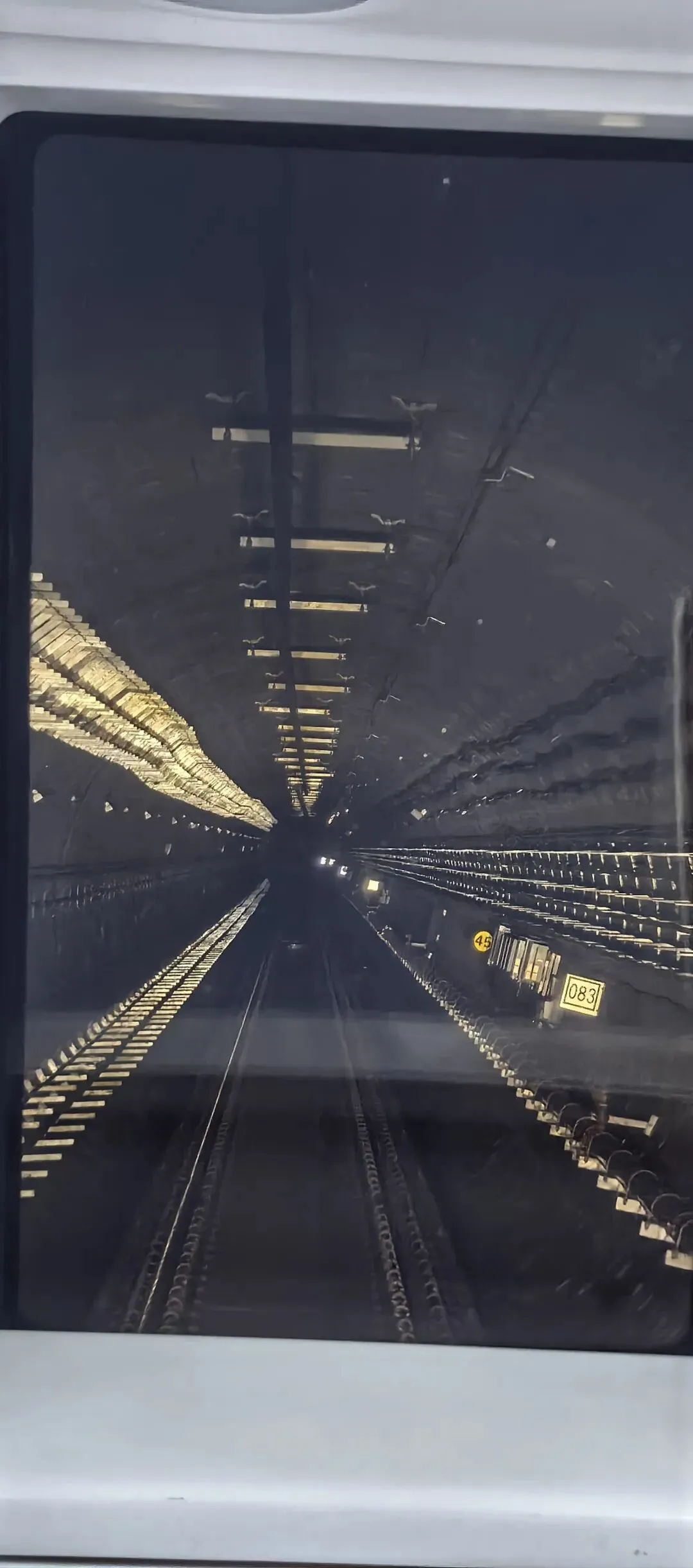 黑漆漆的隧道两边,灯光一排接一排往后退,铁轨直直往前延伸,看着就有种要冲进光里的感觉。隧道里的标识清清楚楚,限速牌、轨道旁的设备都看得明明白白,全程不用司机操作,列车自己稳稳地跑,科技感直接拉满。