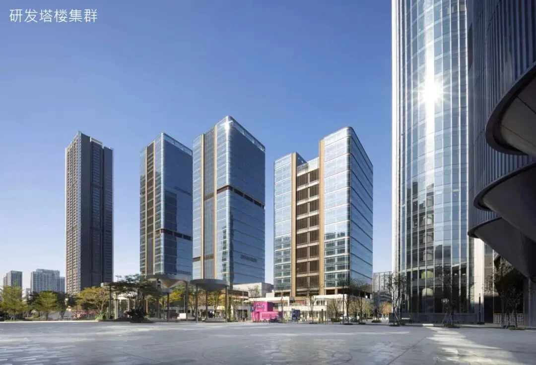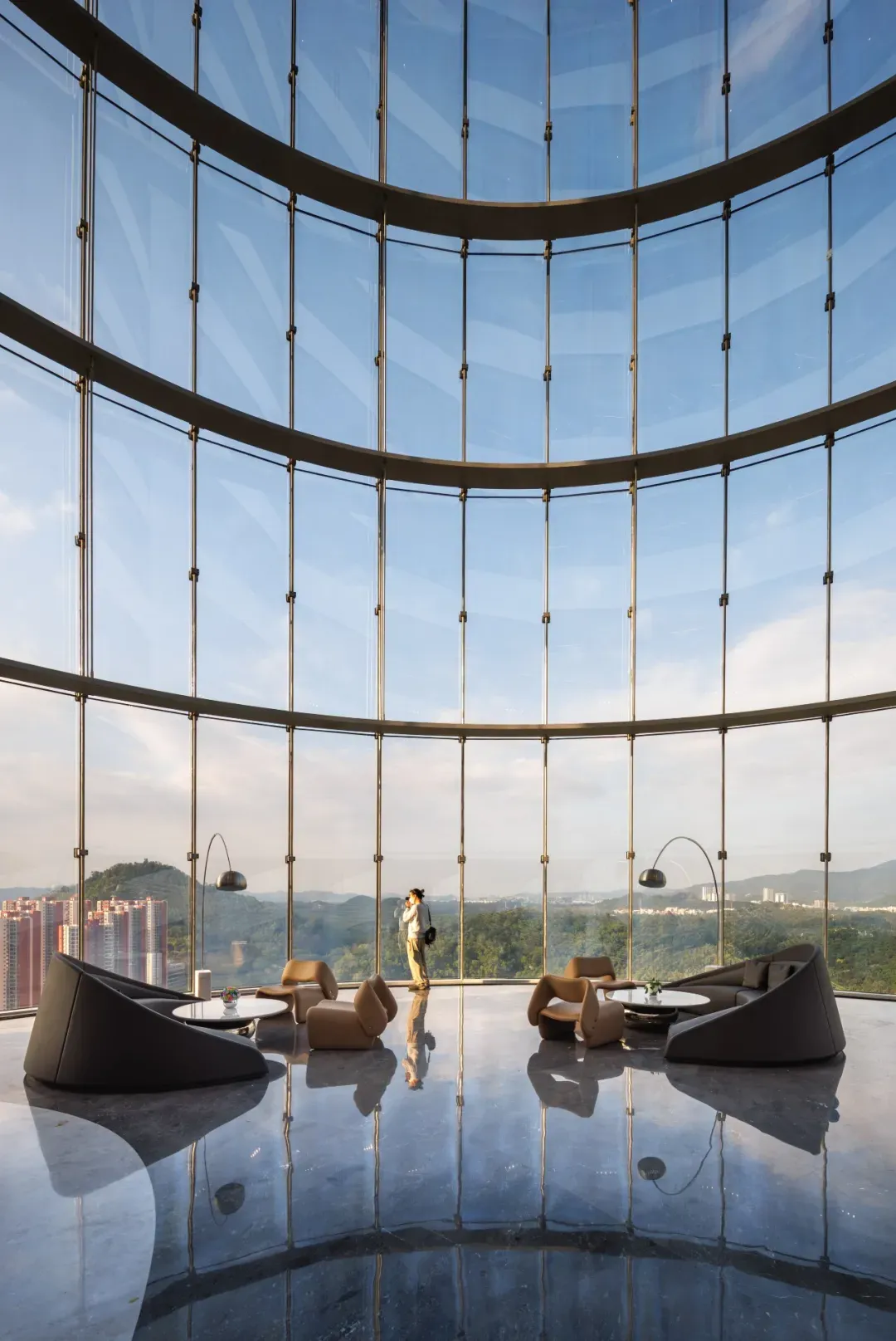 50米通高的总部空中大堂,采用无结构柱、弧形拉索玻璃幕墙设计,将场地周边的壮阔山水纳入办公区视野,并以“湾区灯塔”的地标形象引航片区发展。
