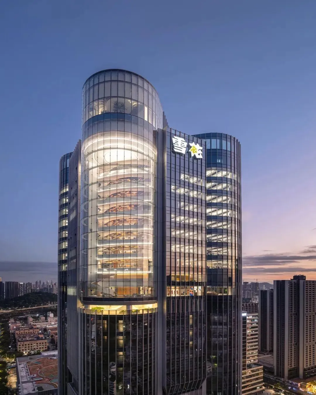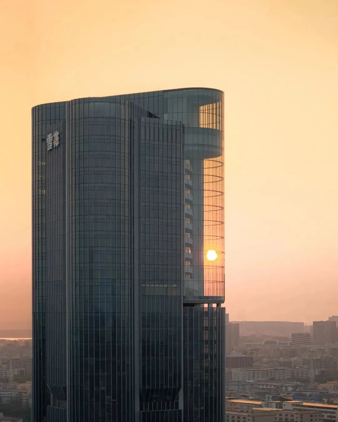 Aedas:雪花啤酒总部大厦策略性落位于双主干道交叉口,以挺拔身姿屹立于宝安“山海连城”规划的北端点,并成为片区城市更新的“源点”。建筑形体呼应啤酒厂筒仓特征,主塔楼立面巧妙融合了大圆弧造型和平直段造型,以“雪花粮仓”的概念意向,通过圆润的塔楼形态,延续了啤酒厂深刻的文化印记。
