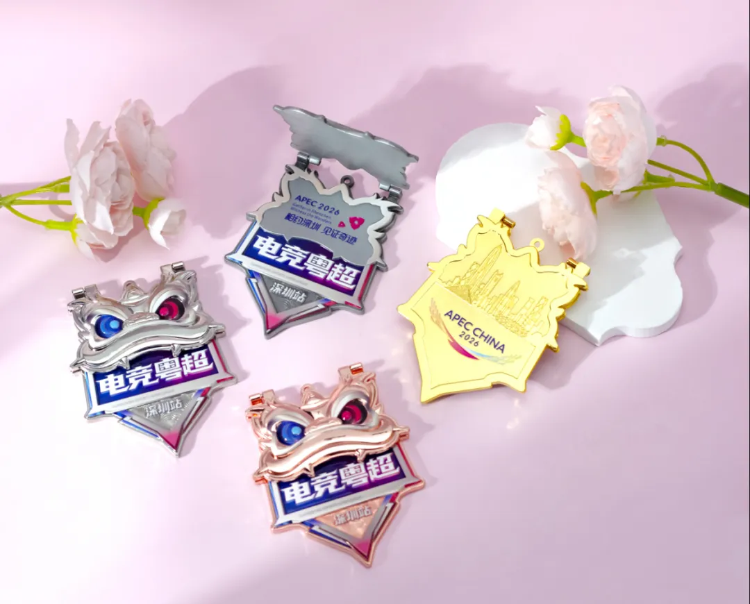 本次深圳站APEC 联名专属奖牌正式惊艳亮相。奖牌以岭南醒狮 + 战场盾牌为设计核心,搭配烫金 “深圳站” 字样;独创开盖醒狮结构,内刻 “相约深圳 见证奇迹・APEC 2026”;背面融合深圳天际线与大鹏展翅 APEC 会标,兼具城市文化与国际格局。所有获胜奖牌支持现场镭射雕刻,让每一份荣耀独一无二。