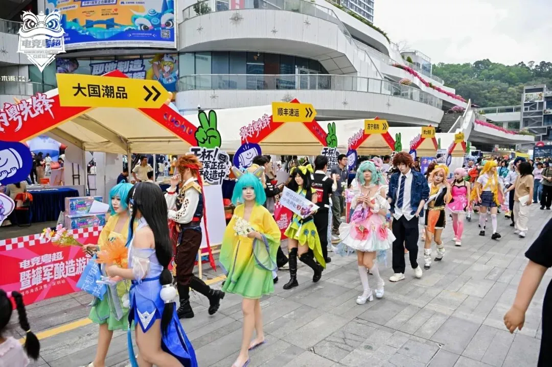 每日 3 场的 COS+IP 大巡游如期上演,本次特别邀请王者荣耀、无畏契约高还原度 Coser 倾情助阵,同时感谢天美米饭联盟、星尚文化传播大力支持,带来超豪华 COS 粉丝团巡游队伍,电竞粤超吉祥物竞小粤、大湾鸡、宠物方阵、顺丰小哥人偶全员集结,全程可互动、可合影,氛围感拉满。