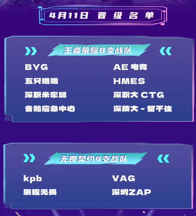 4月11日,经过激烈角逐,赛事顺利决出:王者荣耀 40 进 8,8 支队伍晋级决赛;无畏契约12 进 4,4 支队伍晋级决赛。晋级战队将于4 月12日向深圳站总冠军发起冲击,王者荣耀前两名、无畏契约冠军将代表深圳出征全省总决赛。