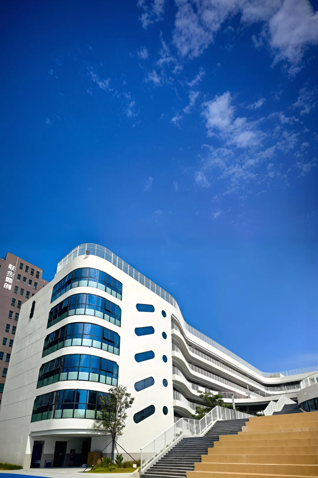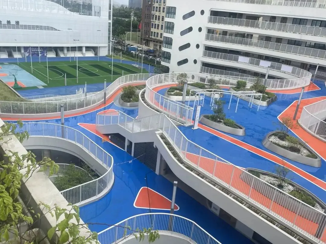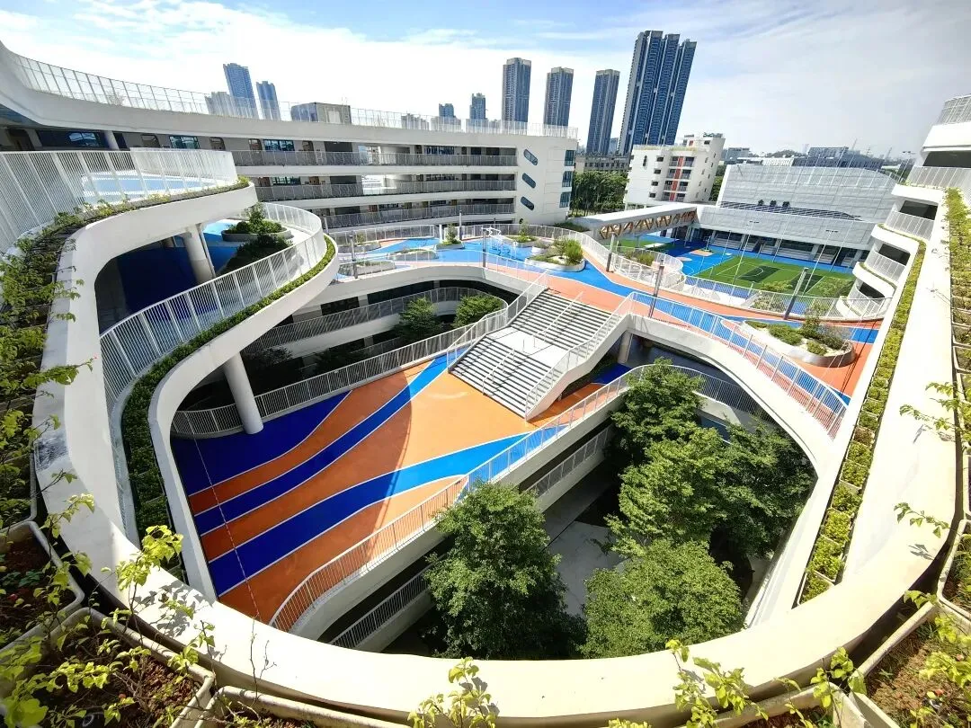以“绿色光明、生态教育”为设计主旨,学校将传统文化底蕴与现代建筑美学深度融合,下沉庭院与空中花园相映成趣,为学生打造了兼具自然气息与人文氛围的学习生活空间。学校占地面积约1.8万平方米,总建筑面积约4.2万平方米,设计办学规模为36个教学班,其中小学24个班级,初中12个班级。校园环境优美,设施齐全,包括高标准的图书馆、体育馆、多功能厅等场馆,以及音乐、美术、科创等学科功能室,满足学生个性化成长需求。尤为突出的是,依托深理工在科研设施、学术与师资资源上的优势,学校科创功能室与深理工相关实验研究室(所)形成资源联动,为学生开展早期科研启蒙提供了优质软硬件支撑。