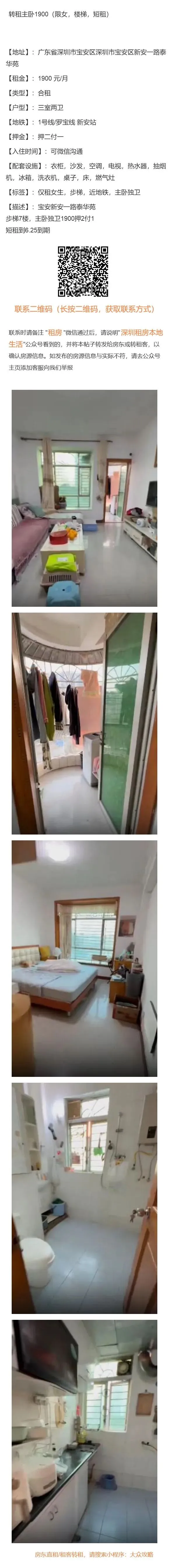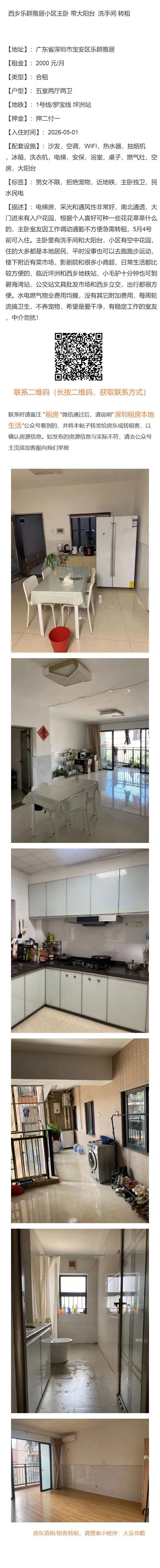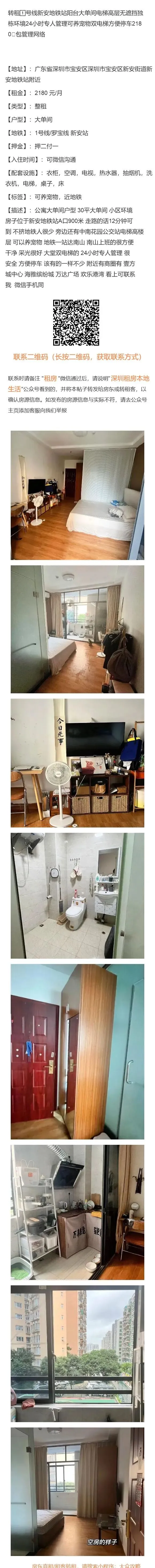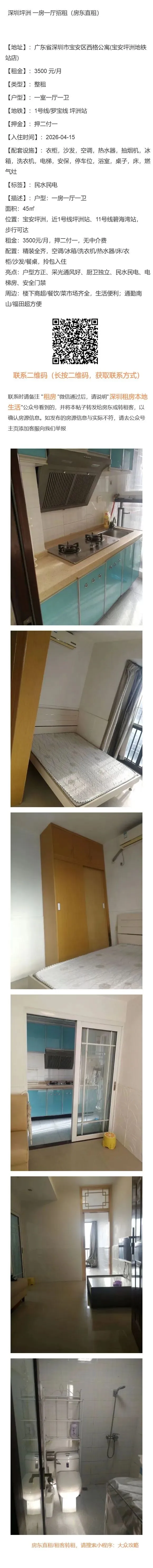 【深圳租房本地生活:免责申明】以上内容受用户委托发布,谢绝转载。房源信息的真实性、合法性由提供者负责,本公众号不声明或保证内容之正确性和可靠性,深圳租房需谨慎,请先核实出租人身份,仔细阅读租房合同,切勿轻易转账、交订金等,房屋出租过程中产生的一切问题,与本公众号无关。【深圳租房本地生活:特别申明】深圳租房本地生活没有任何线下业务人员,请勿轻信冒认我司线下工作人员及电话沟通人员,我司目前唯一对外沟通窗口为公众号主页客服微信:Hey_Beijinger