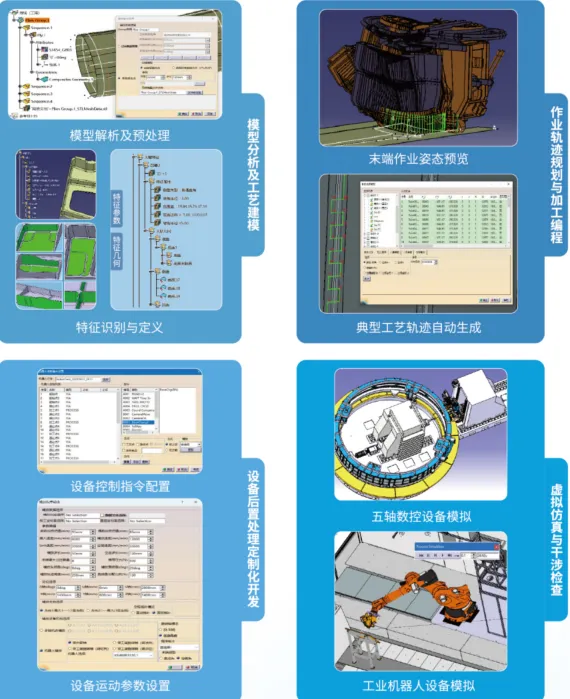 2、制造工艺编程软件。深度融合制造工艺,提供模型处理、复杂轨迹编程、程序生成及仿真模拟等软件功能及相关技术服务。针对复材自动铺放、装配自动制孔/钻铆、激光加工等航空典型制造工艺,开发了离线编程与仿真系列软件,具备工业机器人、五轴数控设备等加工程序自动生成及仿真验证功能。