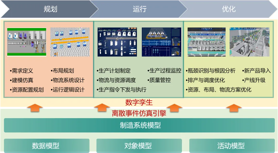 5、制造系统规划与运行优化平台。以建模仿真为核心、以数字孪生为载体的制造系统分析平台,贯通制造系统从规划、仿真到执行与优化的闭环,实现制造系统的定量分析与有效预测,形成可扩展、可演进的平台能力,支撑行业能力复用。