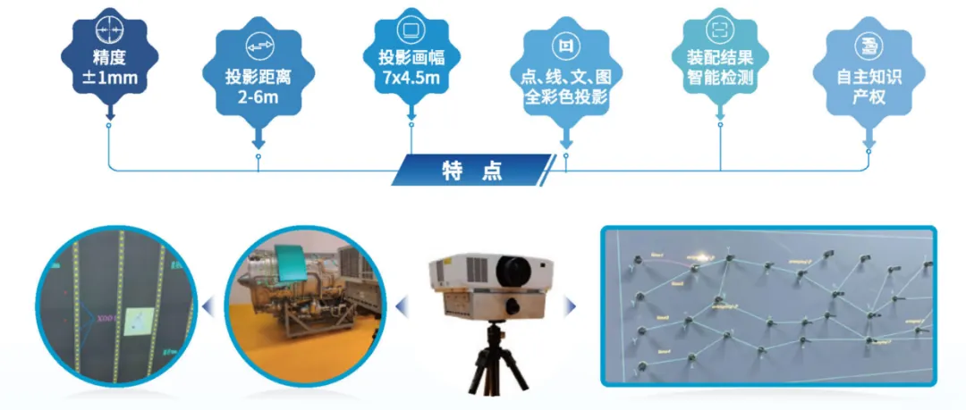 6、AR光学投影系统。 “软-硬”件一体化系统,应用于飞机壁板制孔、紧固件安装、发动机管路安装等场景,将工艺信息直接投影在产品表面,引导操作人员完成复杂装配任务,并在产品表面投影反馈装配结果,提高装配效率和质量一致性。
