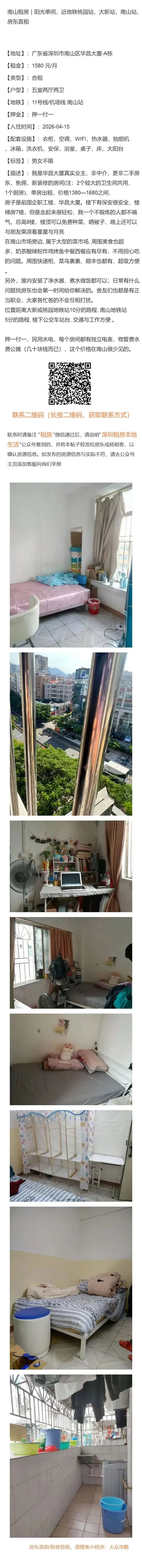 南山租房|阳光单间,近地铁桃园站,大新站,南山站,房东直租