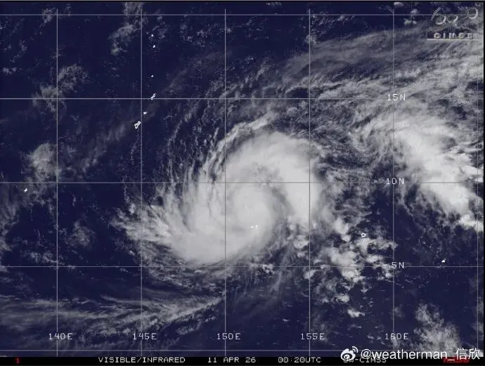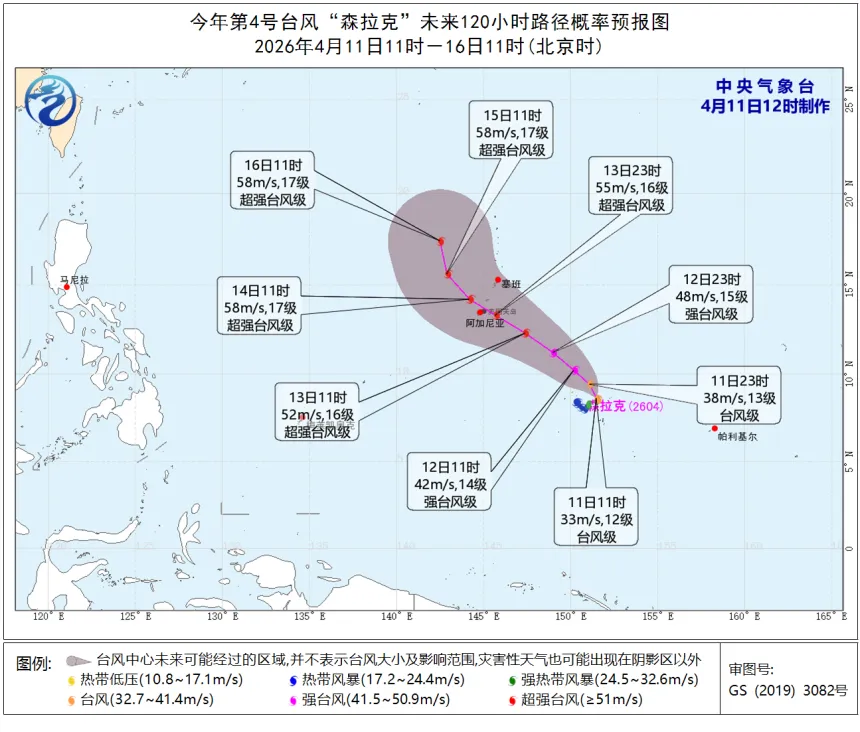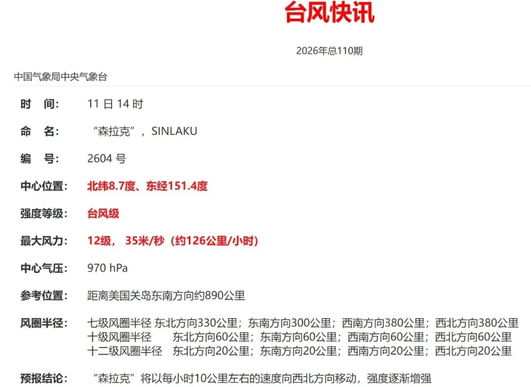据中央气象台发布的消息,今年第4号台风“森拉克”已于今天(4月11日)上午由强热带风暴级加强为台风级,中心附近最大风力有12级(33米/秒),中心最低气压为975百帕,七级风圈半径为300—380公里,十级风圈半径为60公里。上午08时其中心位于美国关岛东南方向约920公里的西北太平洋洋面上,距离深圳4000公里以上。