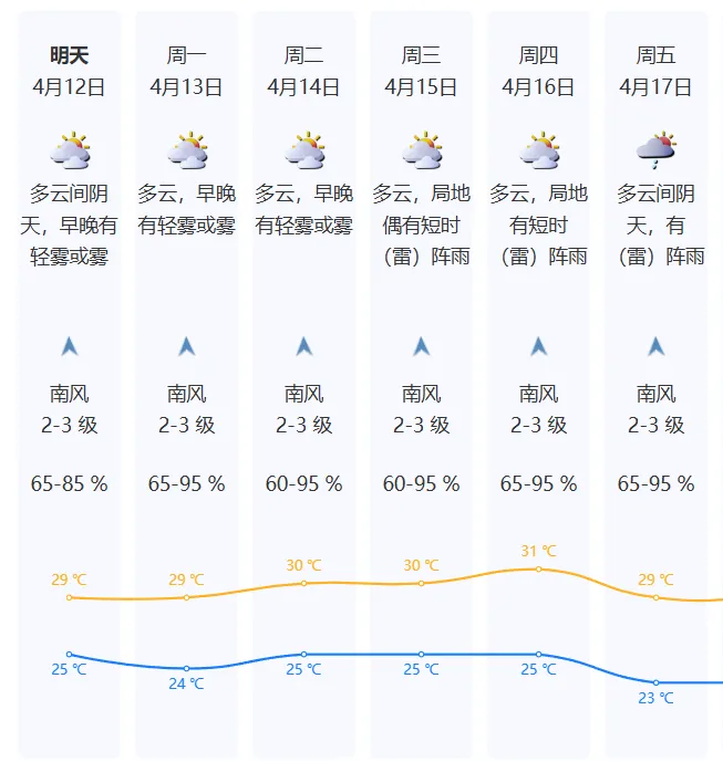 4月12日—4月14日多云间阴天,早晚有轻雾或雾,间中局地偶有零星小雨,午间较热,4月12日气温25℃—29℃;