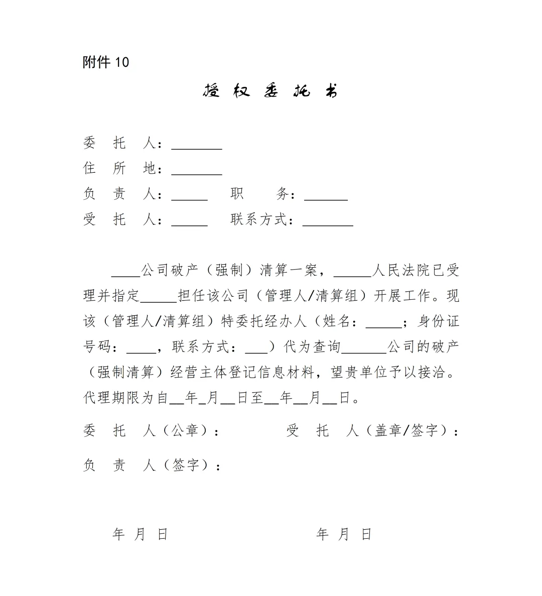 (1)破产管理人的授权委托书(加盖公章,参考样例详见 附件10);
