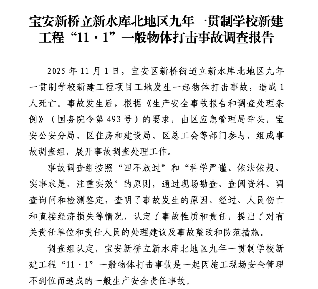 报告显示,2025年11月1日,宝安区新桥街道立新水库北地区九年一贯制学校新建工程项目工地发生一起物体打击事故,造成1人死亡,直接经济损失约人民币190万元。