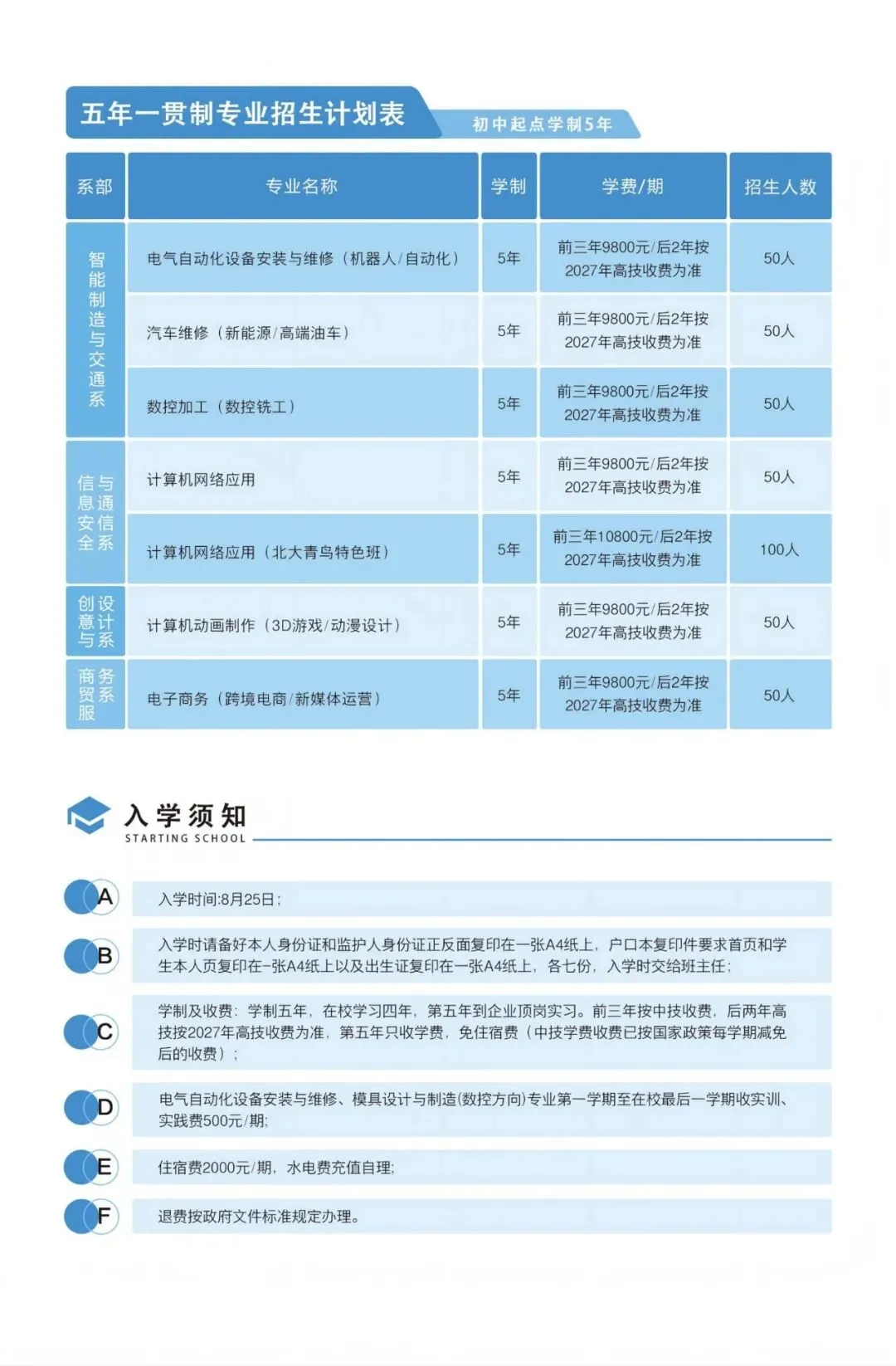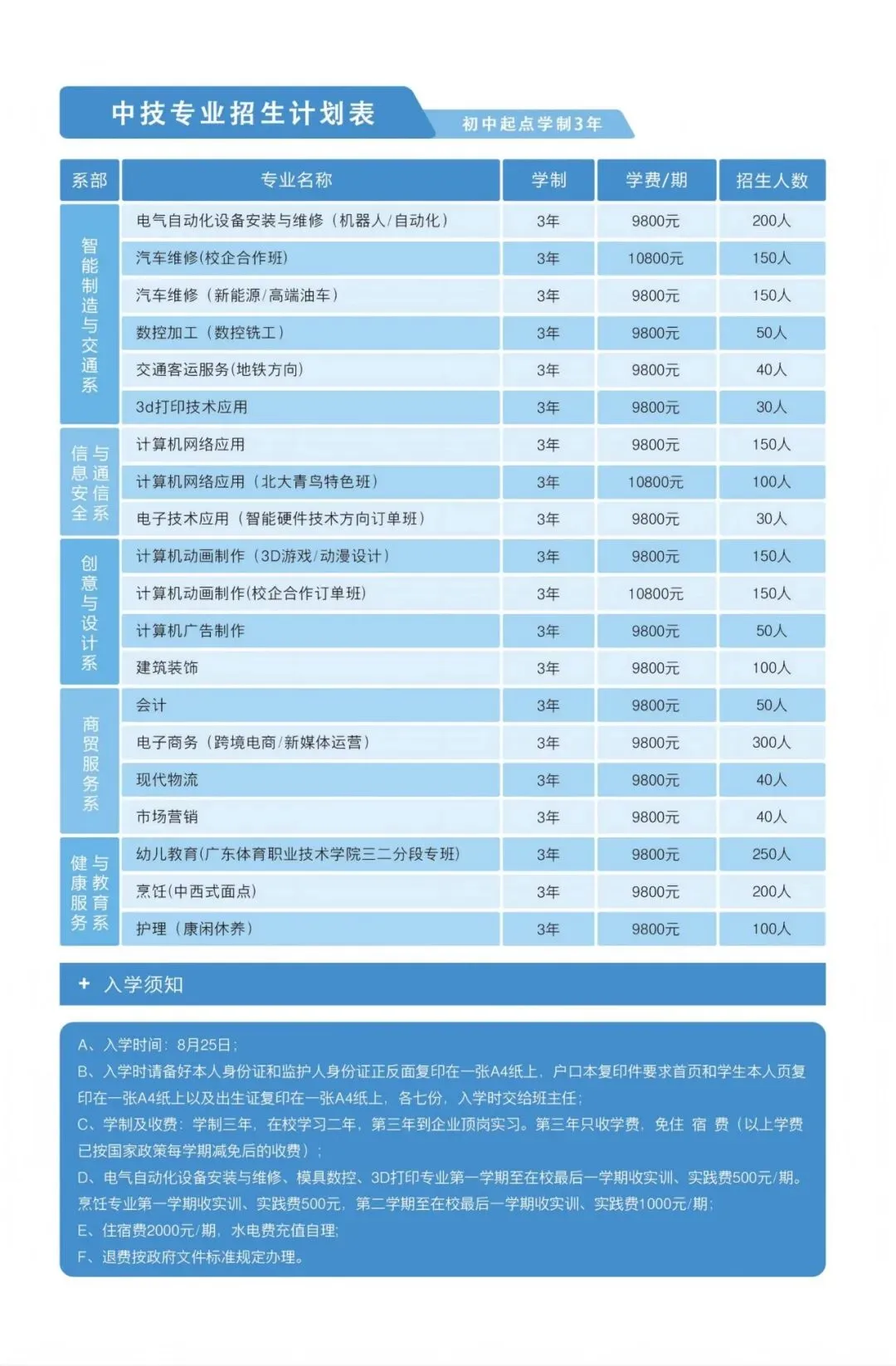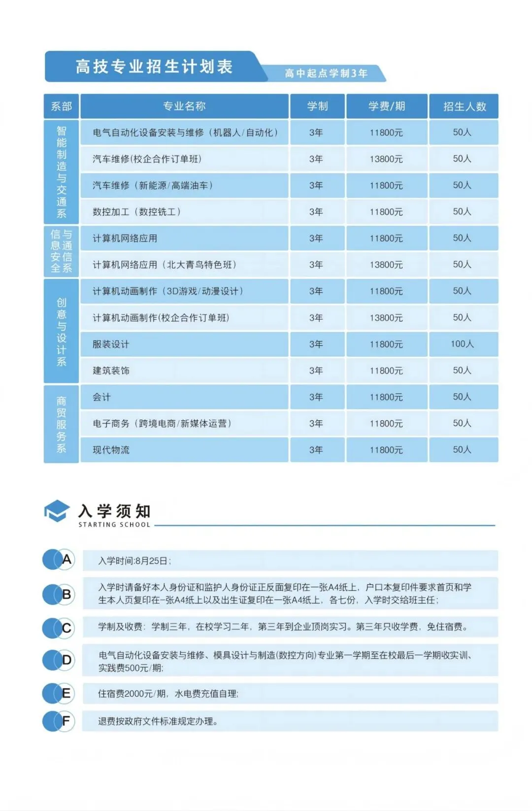 设备安装与维修(机器人/自动化)、汽车维修、数控加工(数控铣工)、交通客运服务(地铁方向)、3D打印技术应用、计算机网络应用、电子技术应用、计算机动画制作(3D游戏/动漫设计)、计算机广告制作、建筑装饰、会计、现代物流、市场营销、幼儿教育、烹饪(中西式面点)、护理(康闲修养)、