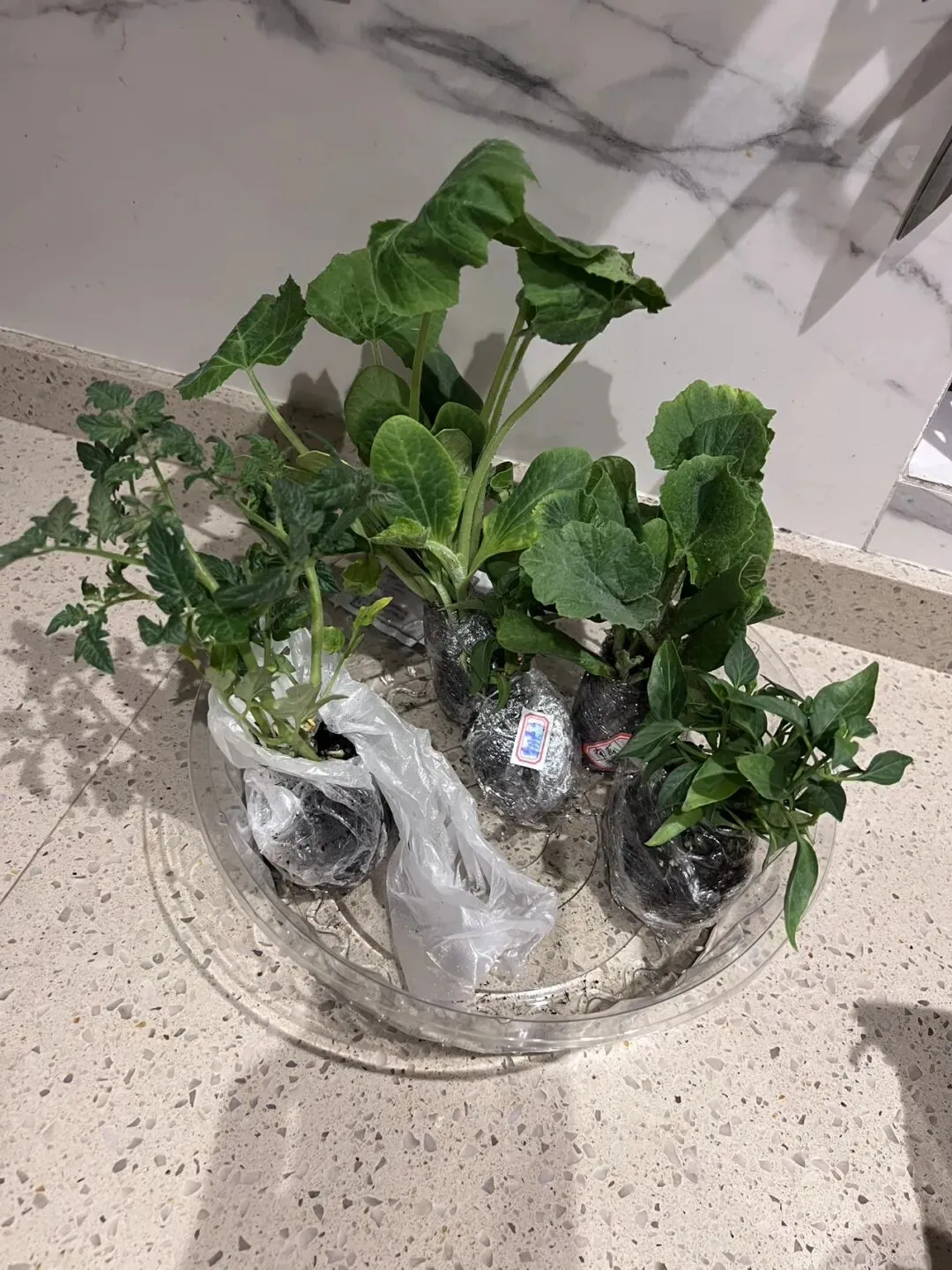 又收到了南瓜、辣椒、西红柿、香葱、佛耳瓜等苗,都栽上了。