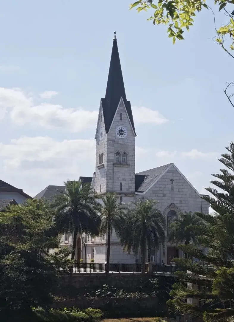 在教堂钟楼、欧式拱门及彩色小屋前留下美照
