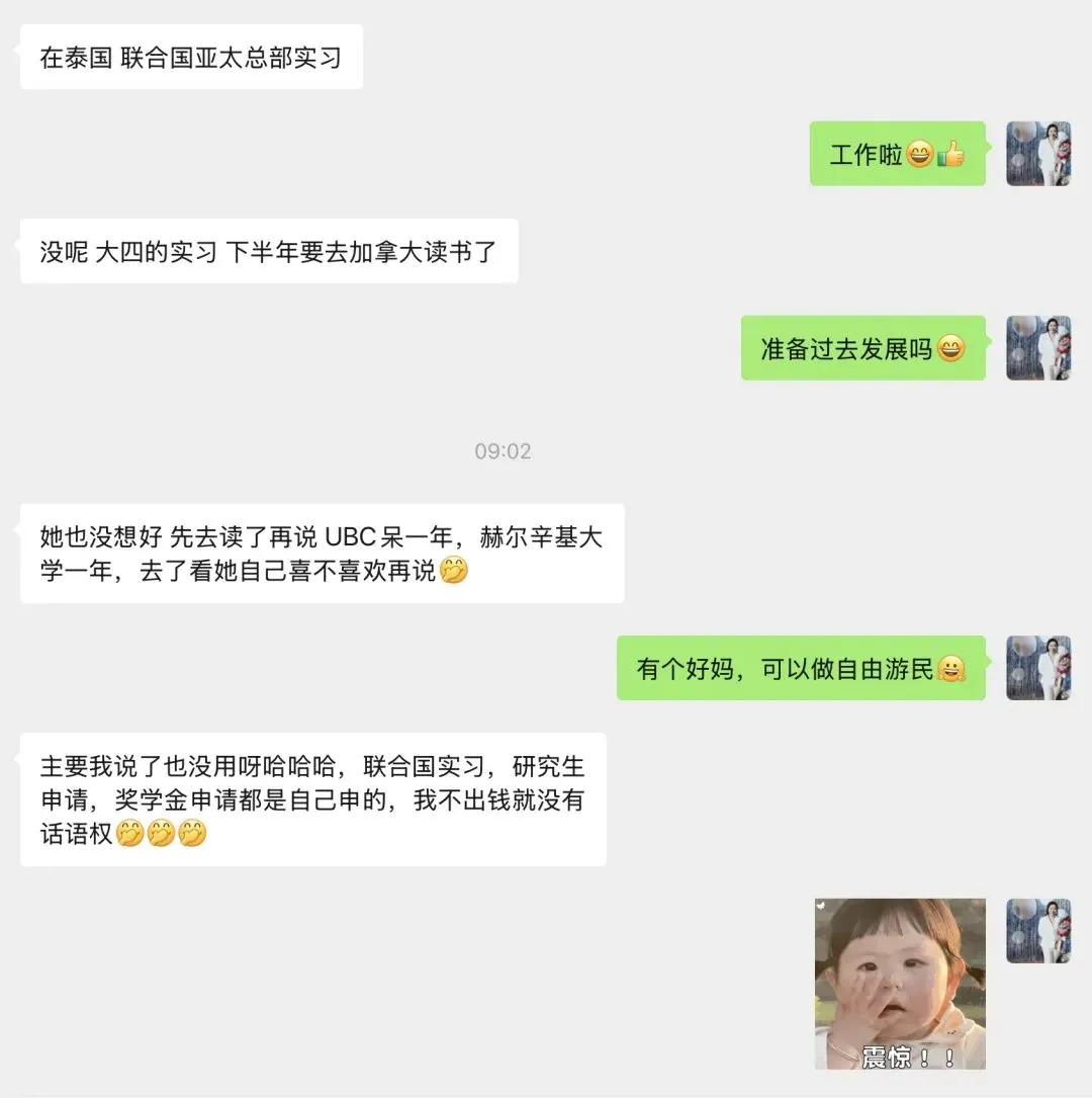 今早聊天她告诉我,女儿大四了,正在泰国联合国亚太总部实习,下半年准备去加拿大读研。