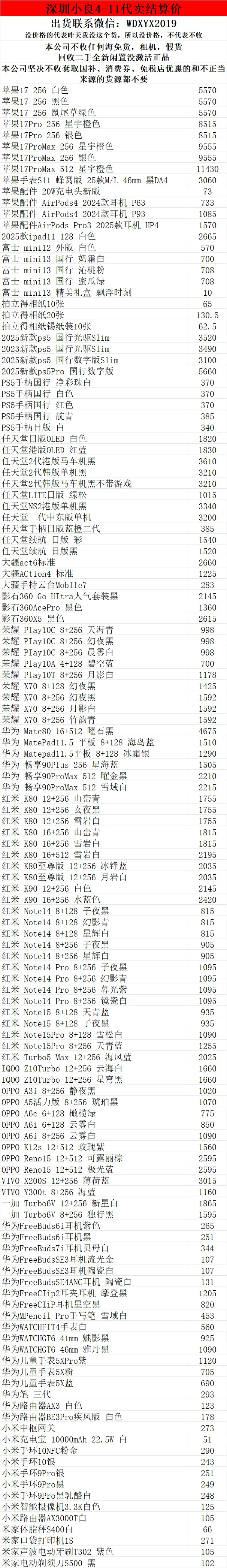 >深圳小良2026.4.11电子产品代卖结算价(美妆价格小程序查看)