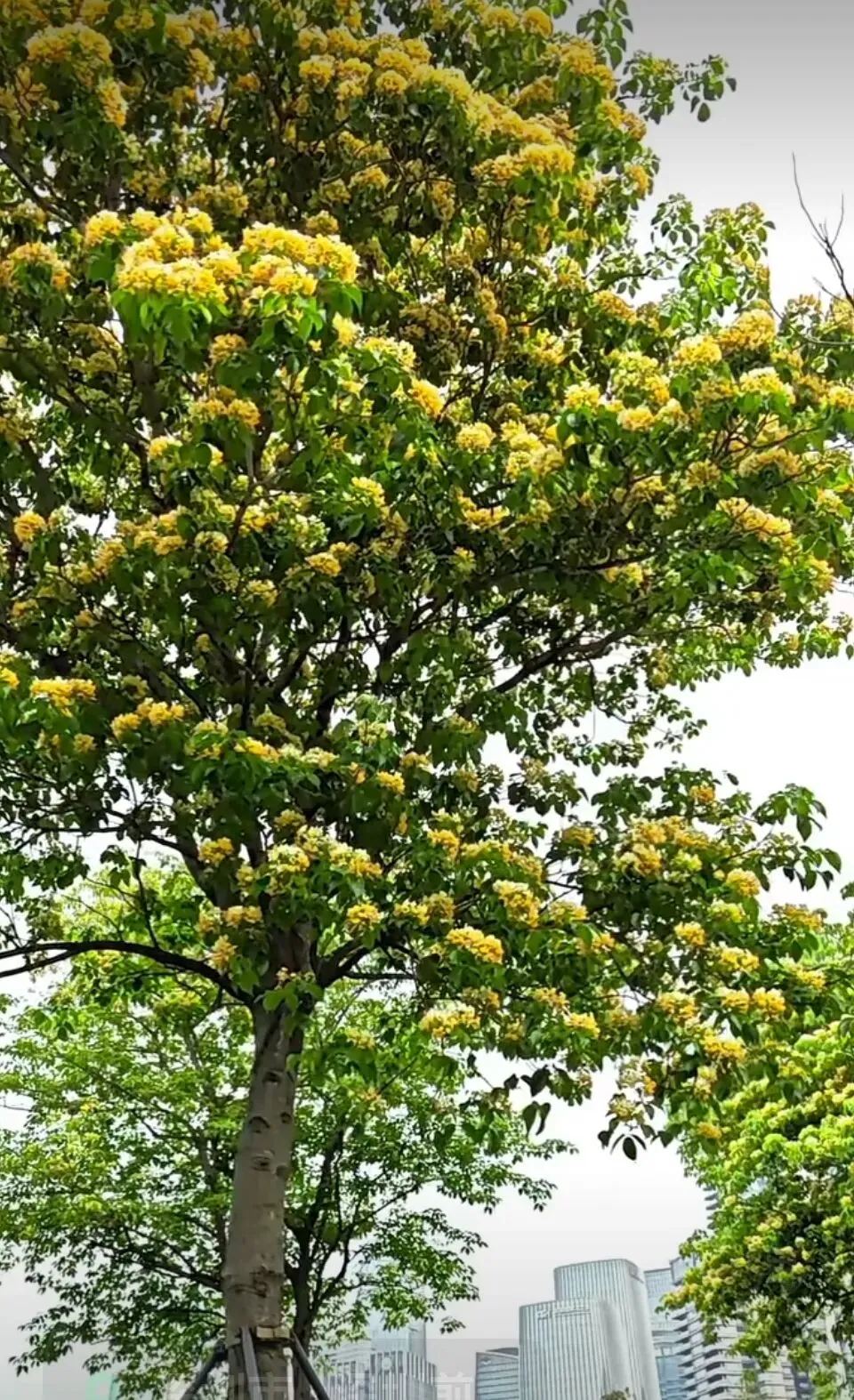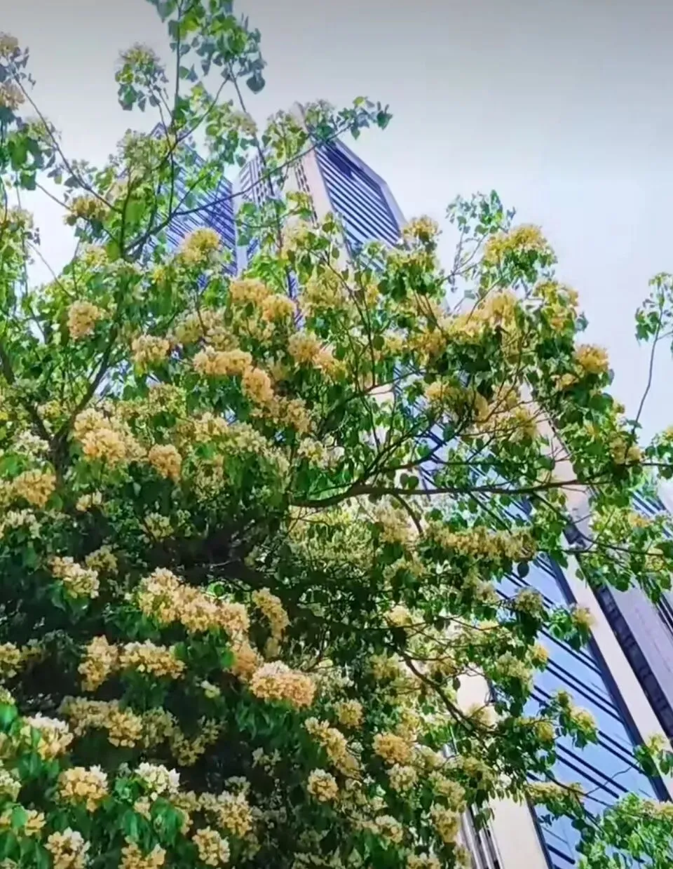 深圳前海桂湾,高大的鱼木花树便在高楼与绿意间,悄悄铺开一场金色的浪漫。
