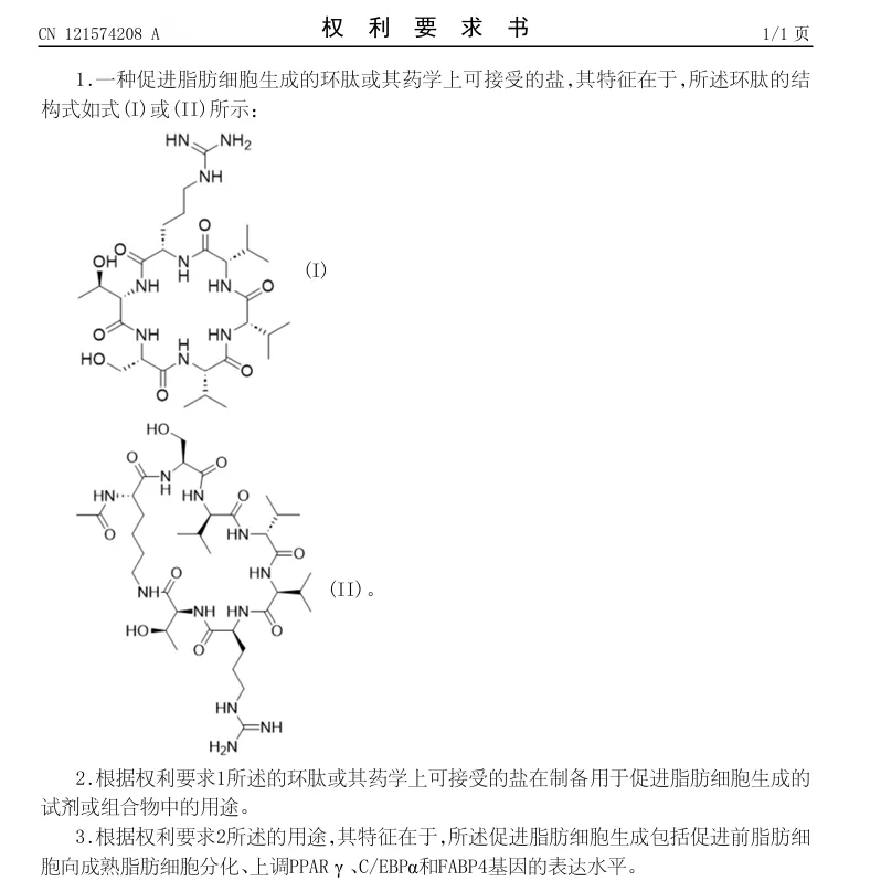 1.专利号:CN121574208A,专利名称:一种促进脂肪细胞生成的环肽及其在化妆品中的应用,申请日:2025.11.12,公布(开)日:2026.02.27,