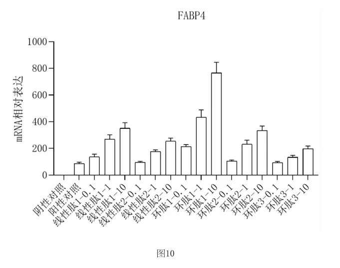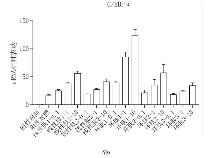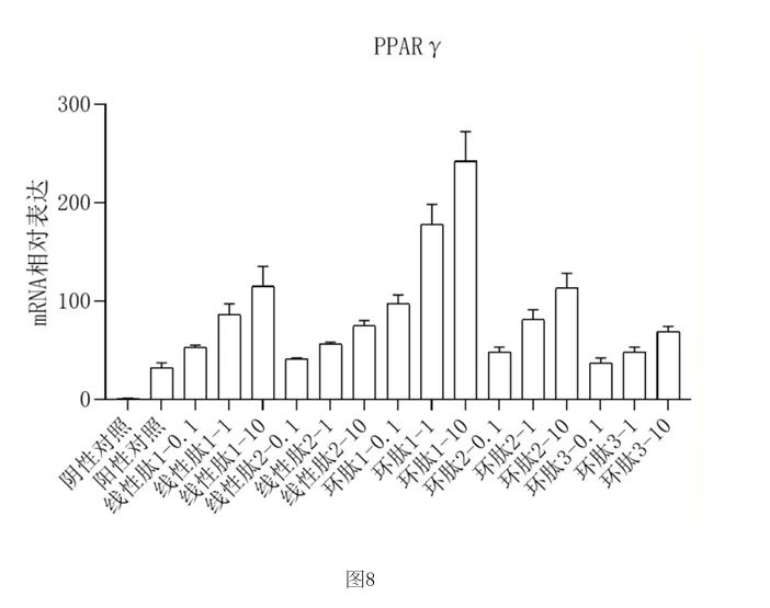 使用qPCR检测PPAR γ 、C/EBPα和FABP4的表达,并计算相对表达量,结果如图8‑10所示,可以看到,本发明的环肽1和环肽2在标准诱导方案的基础上,可以进一步上调关键脂肪 生成基因的表达水平。