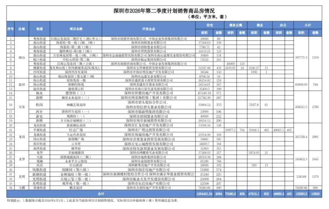 近期深圳发布了2026年二季度计划销售的商品房,其中有31个住宅项目计划入市,共计9064套,平均每个月入市3021套。如果计划入市的商品房住宅在接下来三个月都推出来,对深圳楼市的冲击要大于前几个月。