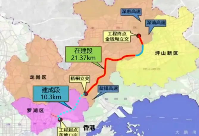 作为深圳“东进东出”的核心大动脉,东部过境高速的复工消息,让盼了十几年的市民终于看到希望。这条高速全长32.2公里,双向6-8车道,北起坪山坑梓街道,南至罗湖莲塘街道,直接衔接莲塘口岸,贯穿罗湖、龙岗、坪山三大行政区,是串联东部三大片区的关键交通要道。