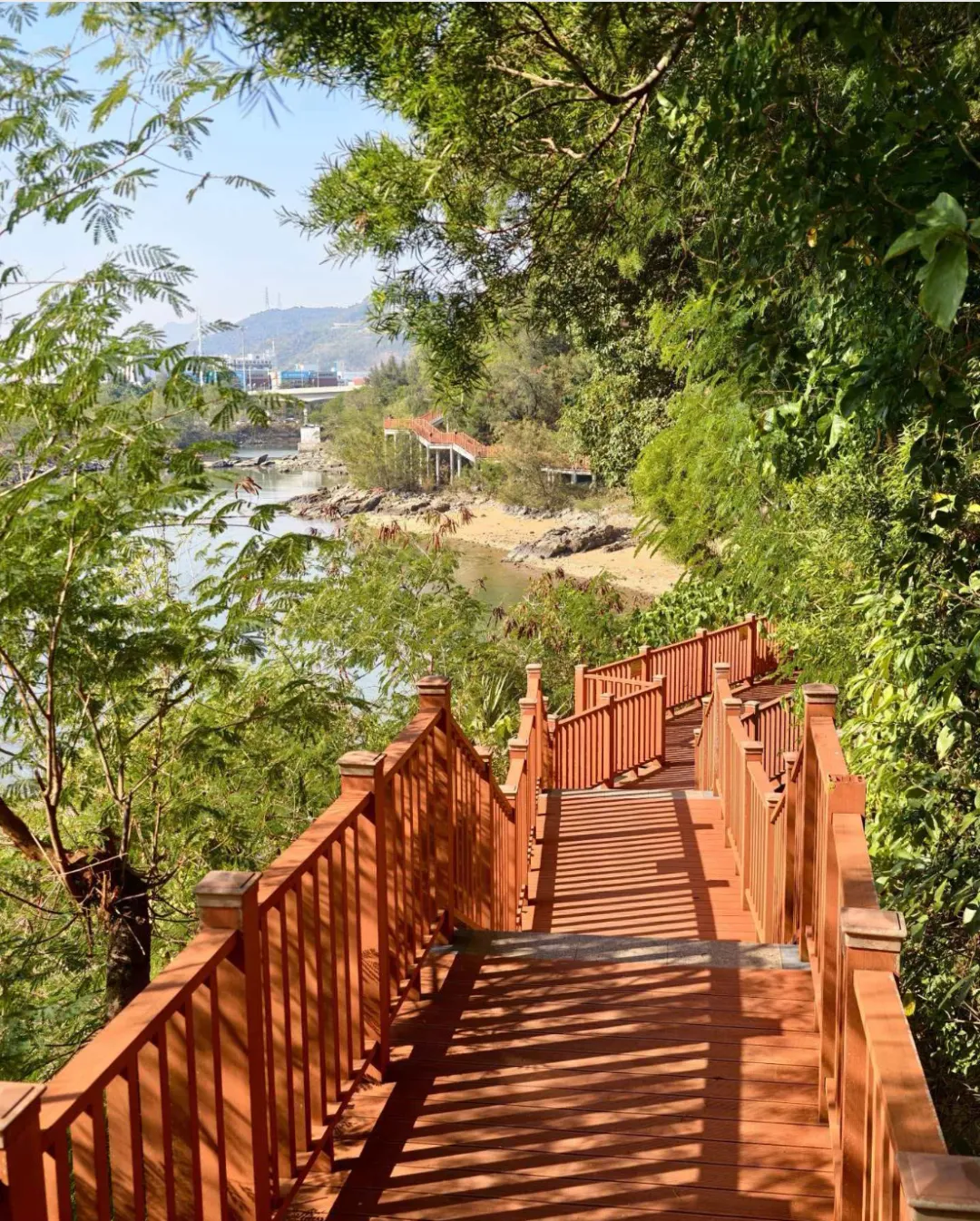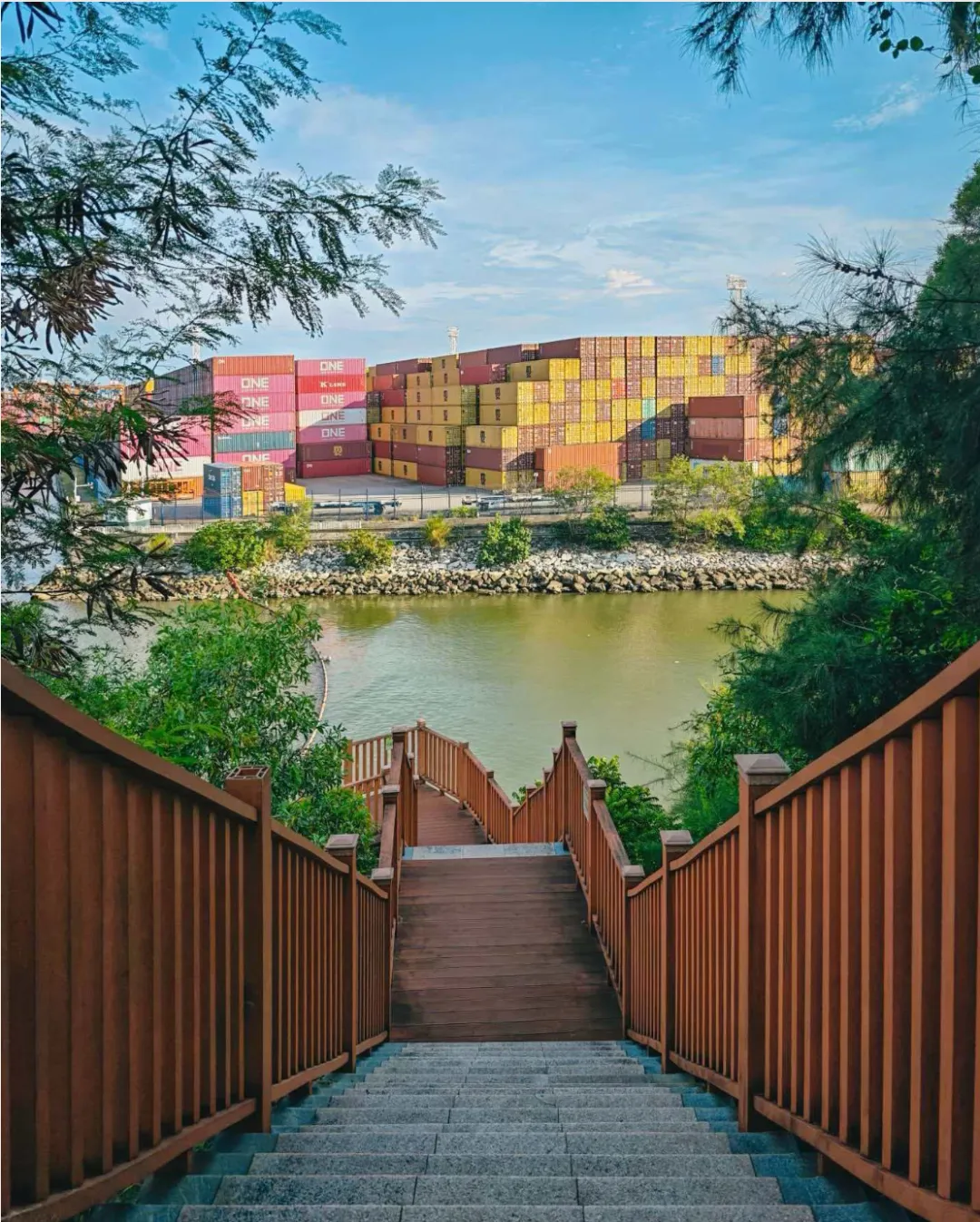 - 漫步山海之间:木质栈道穿行,一侧山林,另一侧盐田港彩色集装箱,像打翻的调色盘