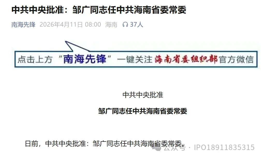2026年4月,中共中央批准:邹广同志任中共海南省委常委。