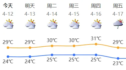 4月12日,多云间阴天,早晚有轻雾或雾;气温24℃—29℃;南风2级—3级,沿海、高地和海区阵风6级左右;相对湿度65%—85%。