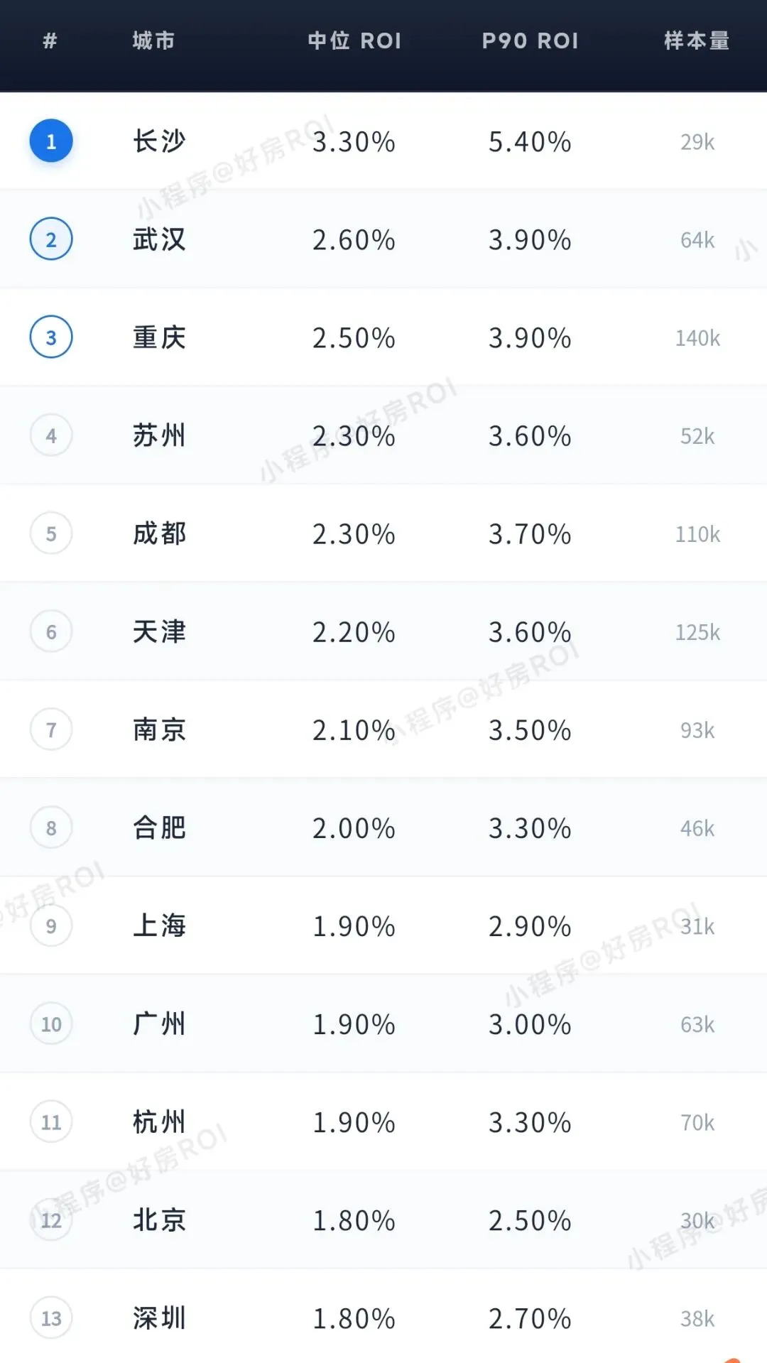 根据榜单,长沙、武汉、重庆的中位ROI超过2.5%,而六个核心城市(北上广深杭)租售比都比较低,北京、深圳更是垫底。再看看P90ROI ,长沙租售比高达5.4%,北京租售比才2.7%,长沙是北京的两倍。举个例子,同样花200万买房收租, 在长沙18.5年就能回本,在北京要花37年才能回本。想跟全国的购房者交流沟通,欢迎扫码入群: