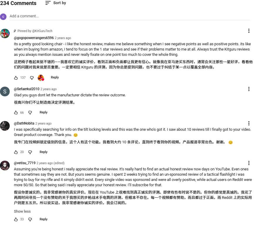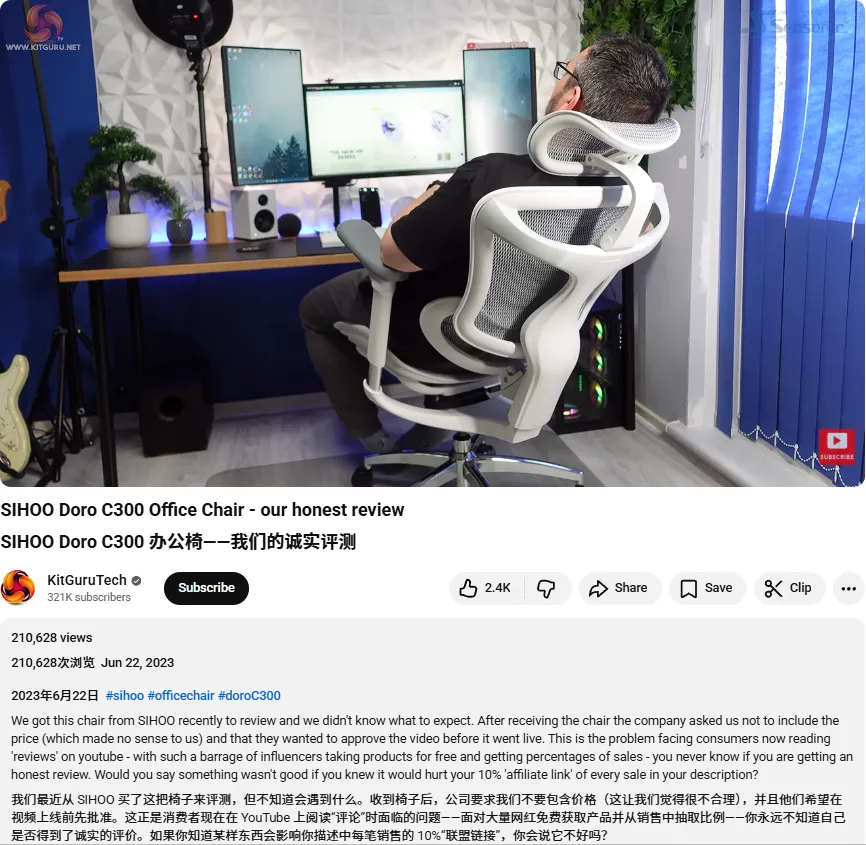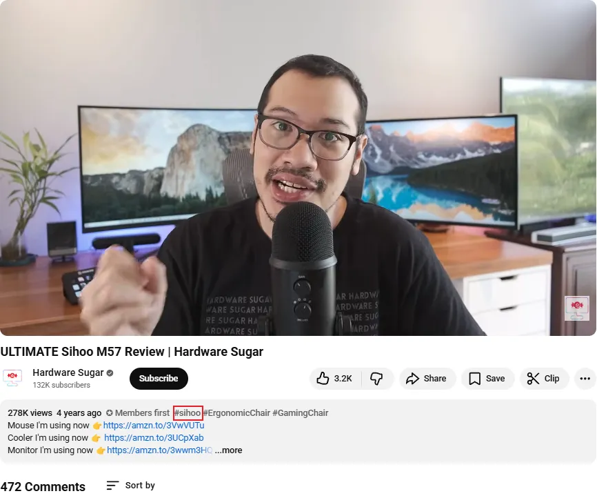 其发布的13分钟视频是西昊在 YouTube 上播放量最高的 KOL 合作视频之一,发布于西昊出海早期阶段(2021 年),对品牌在海外市场的早期认知建立起到了重要作用。视频以"终极评测"为定位,全面覆盖 M57 的外观设计、组装体验、各项调节功能(扶手、腰托、头枕)以及长期使用感受,此外,将其与高端品牌对比,凸显高性价比。该视频播放量278K,点赞量3.2K,评论数472条。