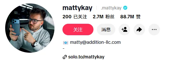 @.mattykay 是西昊在 TikTok 上合作的最大量级 KOL,拥有 270 万粉丝和超 8870 万总点赞,是科技好物种草领域的顶级创作者。账号内容以科技产品开箱、桌面搭建展示和 Giveaway 活动为主,内容节奏快、视觉冲击力强。核心受众为 18—35 岁的科技爱好者和游戏玩家,以英语母语国家用户为主。