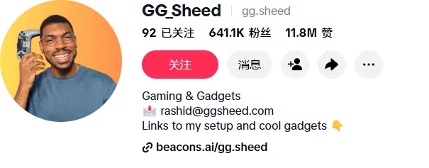 @gg.sheed 是一个专注于游戏外设和桌面搭建的 TikTok 创作者,内容以高颜值桌面搭建展示和游戏设备开箱为主。账号粉丝数641.1K,账号累计获赞1180W。核心受众为 18—30 岁的游戏玩家和科技爱好者,男性为主。