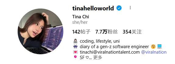 @tinahelloworld(77K+粉丝) 是一位计算机科学学生兼内容创作者,账号内容围绕编程学习、CS 职业规划和生活方式展开,是 CS 学生群体中具有较高影响力的垂直 KOL。账号已获 Instagram 蓝标认证,内容真实感强,粉丝粘性高。核心受众为 18—28 岁的 CS 学生和编程爱好者,女性比例较高,是西昊在年轻专业人士群体中的重要触达渠道。