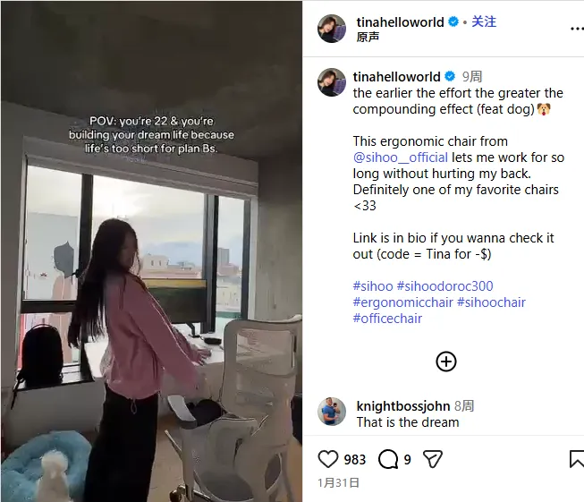 视频以"努力越早,复利效应越大"的励志主题为核心,将 Sihoo 椅子自然融入学习场景,强调"长时间工作不伤背"的功能价值。这种将产品功能与受众价值观(努力、成长)相结合的内容策略,在 CS 学生群体中具有较强的共鸣效果。视频点赞数983,互动率约为 1.28%。