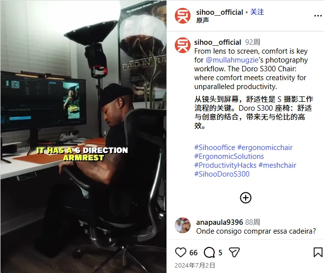 西昊官方号@sihoo_official在 Instagram 上与摄影、设计等创意工作者展开合作,强化“人体工学 + 空间美学”的品牌感知。